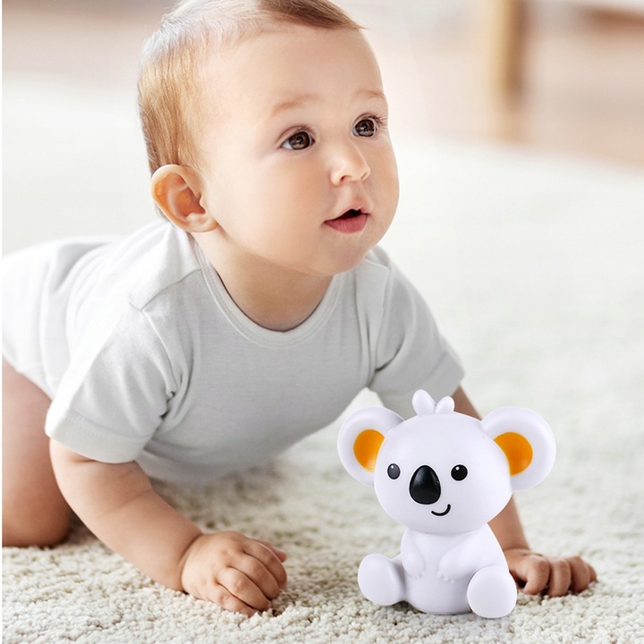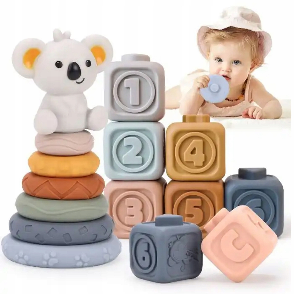 Set cuburi si jucarie de stivuit Matadi Koala cu 14 piese senzoriale din plastic moale,cuburi cu cifre si chitaitoare,inele cu proeminente pentru gingii