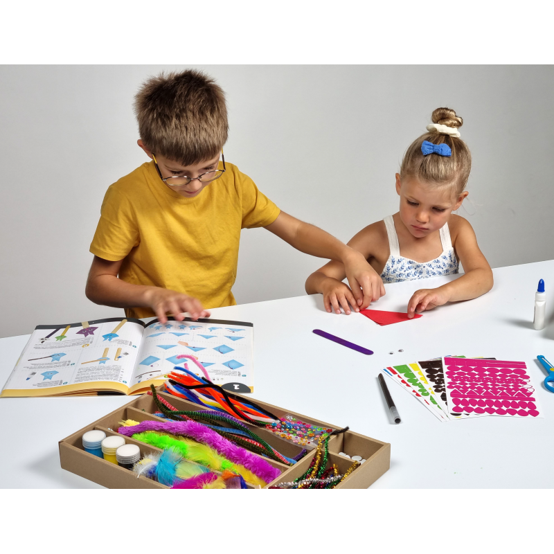 Cei mici pot face o albina, o moara de vant, un crocodil, un semn de carte, o masca, o felicitare cu pompoane si multe altele. Sunt furnizate peste 800 de accesorii, inclusiv o pereche de foarfece, hartie colorata, sarma plusata-diferite modele, fire de bumbac, bete de lemn, nasturi, elemente de fixare din alama, pasla, pix, vopsea etc.