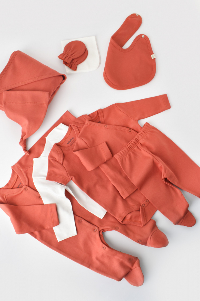 Set complet de nou nascut cu 10 piese confectionat din cel mai delicat si din bumbac organic 100% - material certificat GOTS, delicat cu pielea gingasa a a bebelusului. Printurile sunt cu vopseluri pe baza de apa si toate produsele sunt in concordanta cu standardele GOTS.