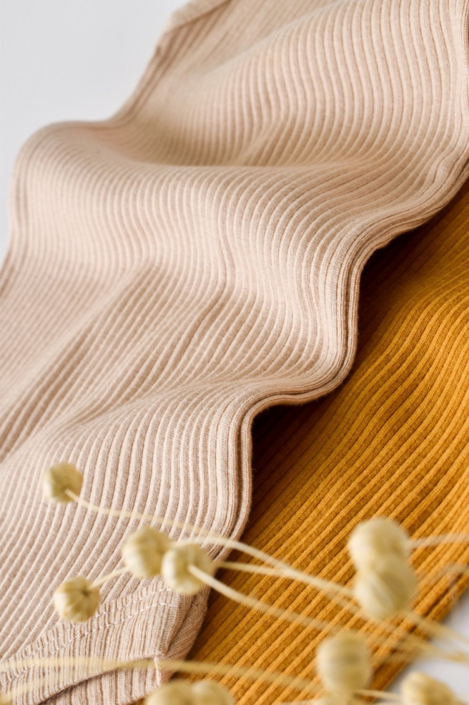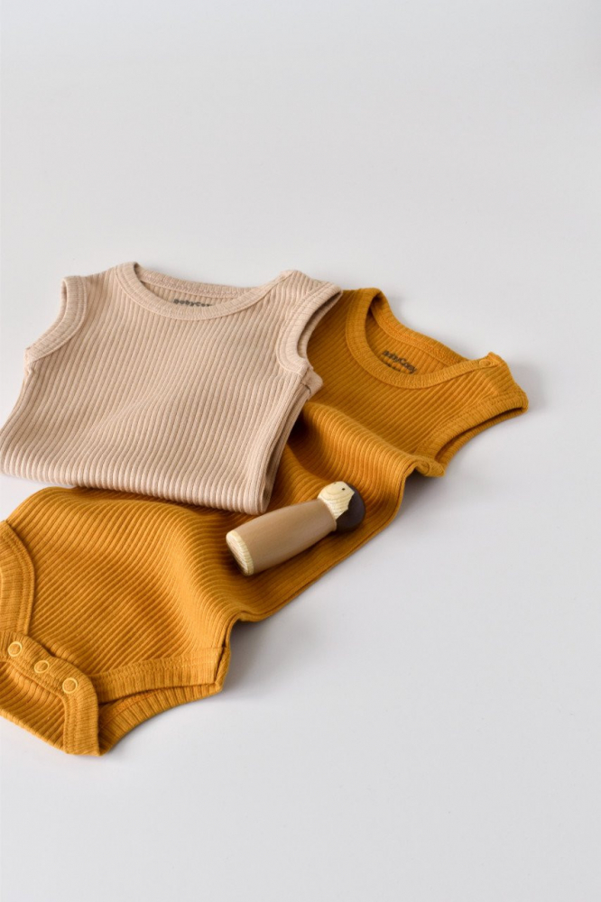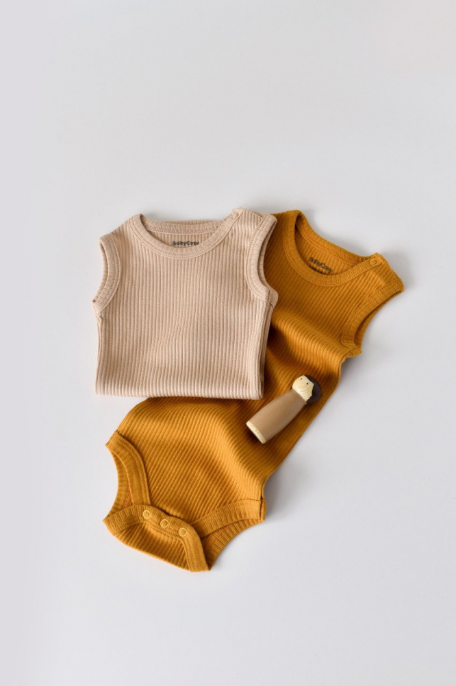Set de 2 body-uri fara maneci din bumbac organic Mustar/Somon marime 0-3 luni