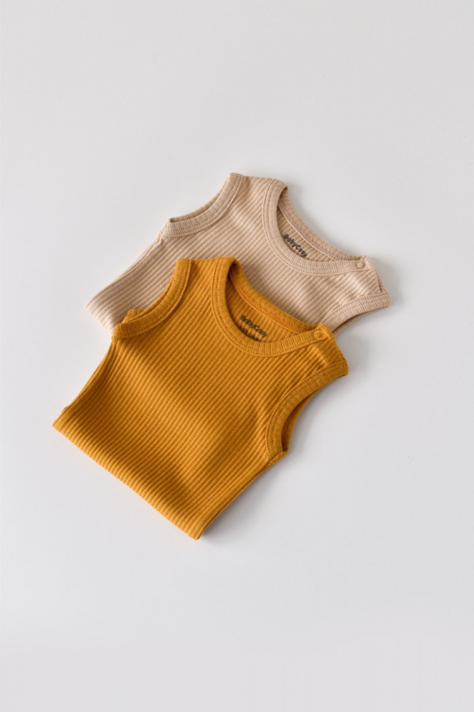 Set de 2 body-uri fara maneci din bumbac organic Mustar/Somon marime 12-18 luni