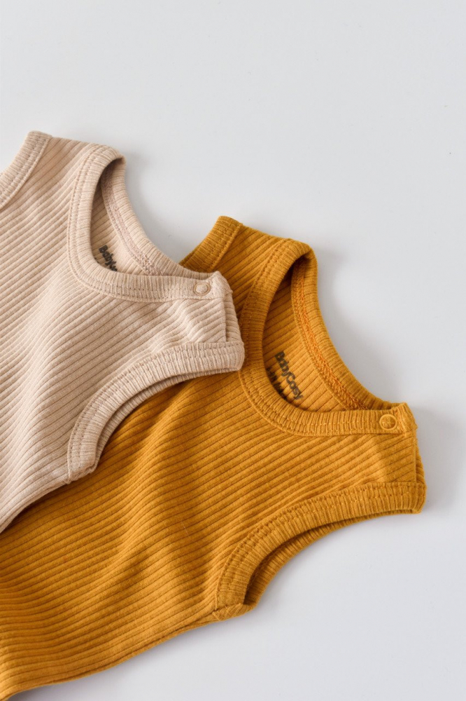 Set de 2 body-uri fara maneci din bumbac organic Mustar/Somon marime 3-6 luni