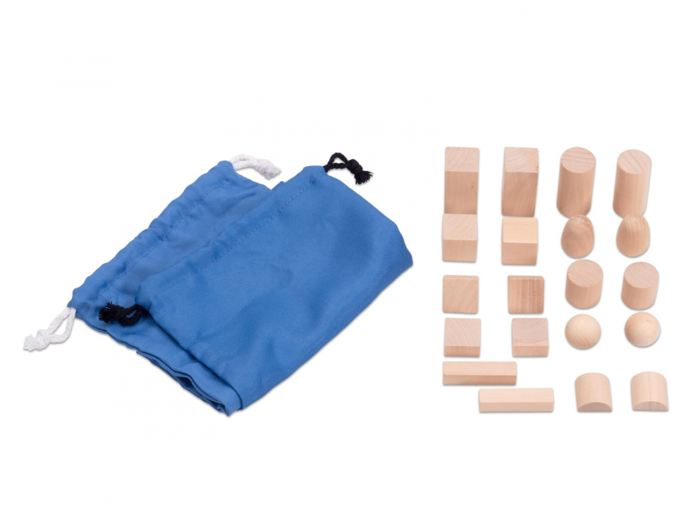 Conținând 20 de corpusuri geometrice din lemn, fiecare cu câte o pereche din următoarele forme: sferă, ou, cilindru scurt, cilindru lung, jumătate de cilindru, cub, cub divizat pe diagonală, cuboid, prismă patrulaterală scurtă și prismă patrulaterală lungă, acest set este ideal pentru lecții de matematică și dezvoltarea abilităților tactile.