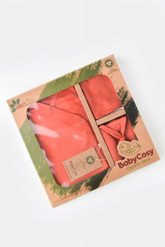 Set complet de nou nascut cu 5 piese confectionat din cel mai delicat si din bumbac organic 100% - material certificat GOTS, delicat cu pielea gingasa a a bebelusului. Printurile sunt cu vopseluri pe baza de apa si toate produsele sunt in concordanta cu standardele GOTS.