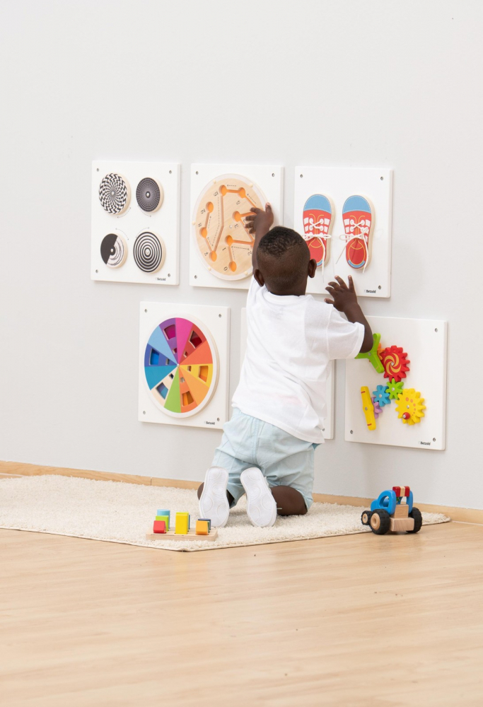 Conceput pentru a încuraja învățarea prin joc, panourile permit celor mici să exploreze diverse activități prin întoarcere, legare, împingere și sortare.