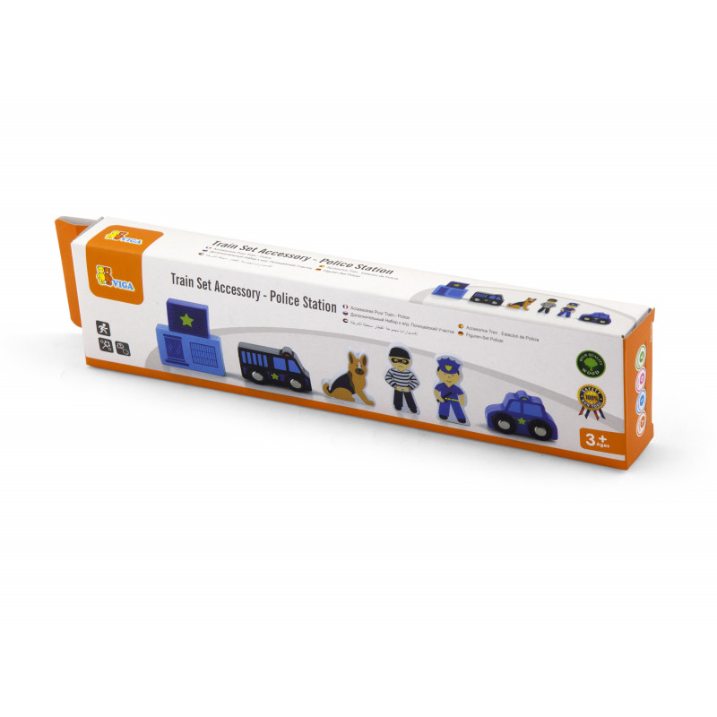 Setul include o sectie de politie, 2 masini de politie, un politist, un caine politist si un infractor incatusat.