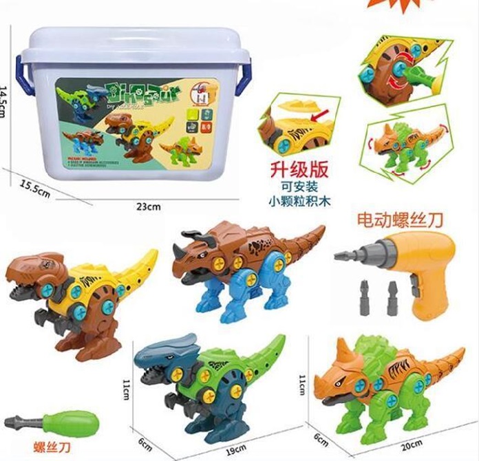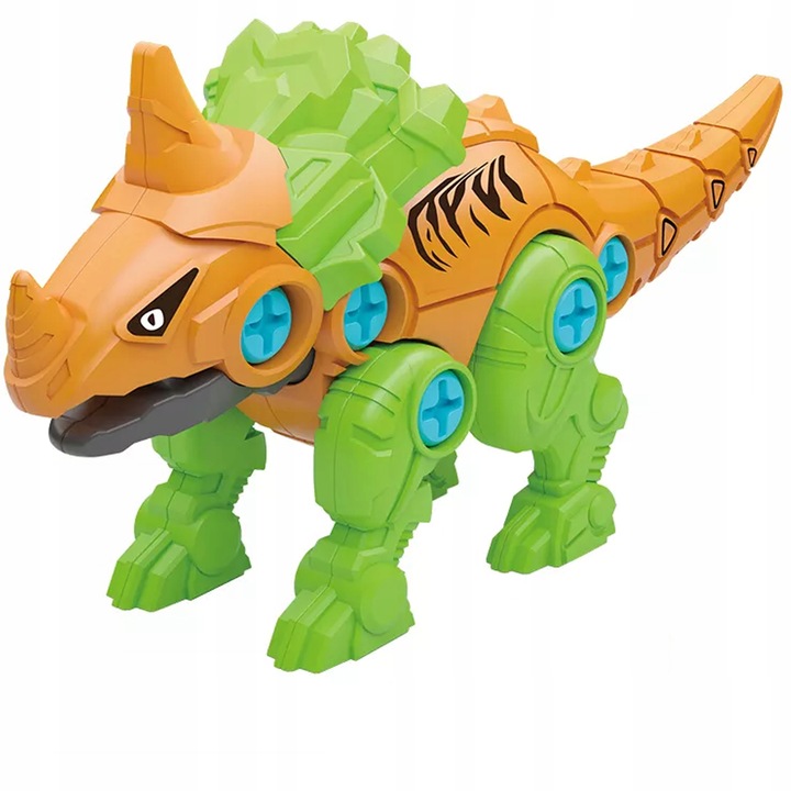 SETUL CONTINE: 4 dinozauri colorati care se construiesc,valiza ,surubelnita ,bormasina (bateriile nu sunt incluse) ,instructiuni.