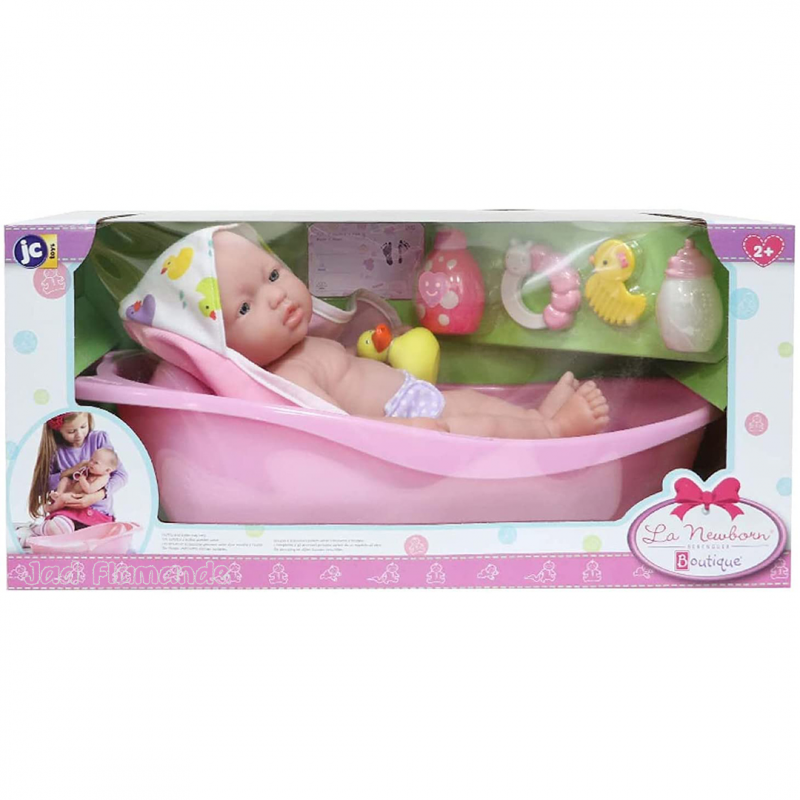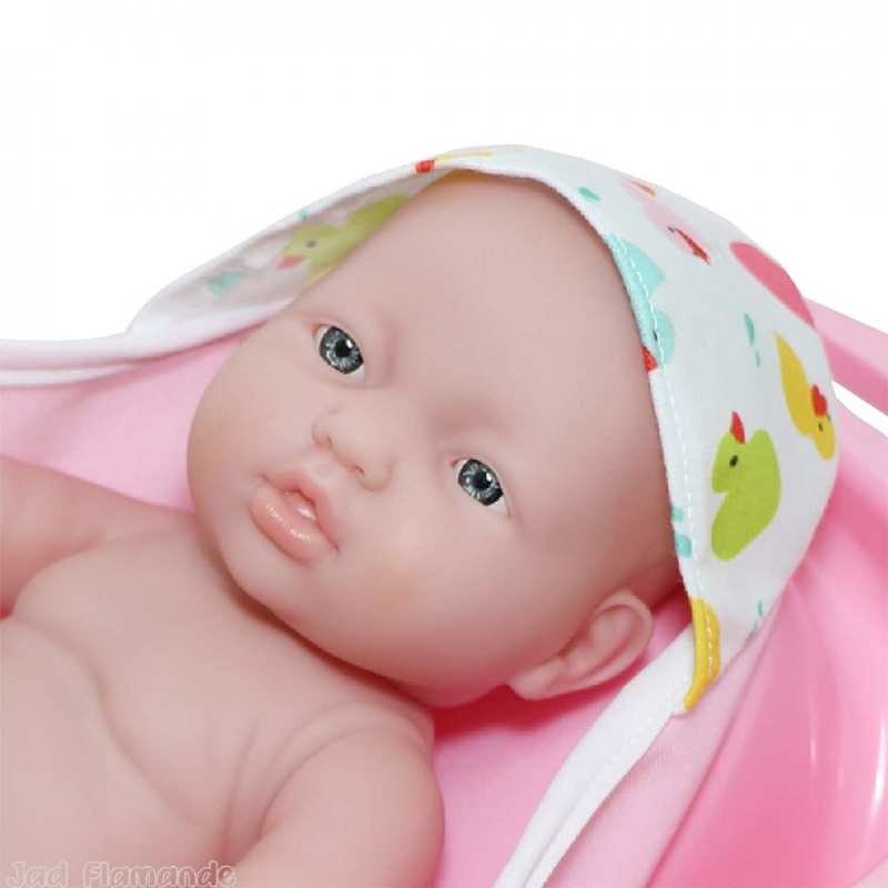 Setul contine o papusa bebelus asezata intr-o cadita de culoare roz, are pe cap un prosopel cu gluga si scutec in nuante de mov cu buline albe.