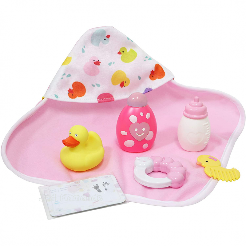 Papusa bebelus vine insotita de un biberon, o jucarie pentru dentitie cu zornaitoare, un pieptan, o sticla de sampon, o jucarie in forma de ratusca pentru baita si certificat de nastere care poate fi personalizat cu numele si alte date de