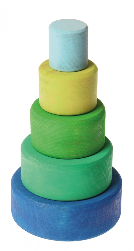 Set de 5 boluri din lemn de anin pentru bebelusi, colorate in nuante de verde, bleu si albastru.