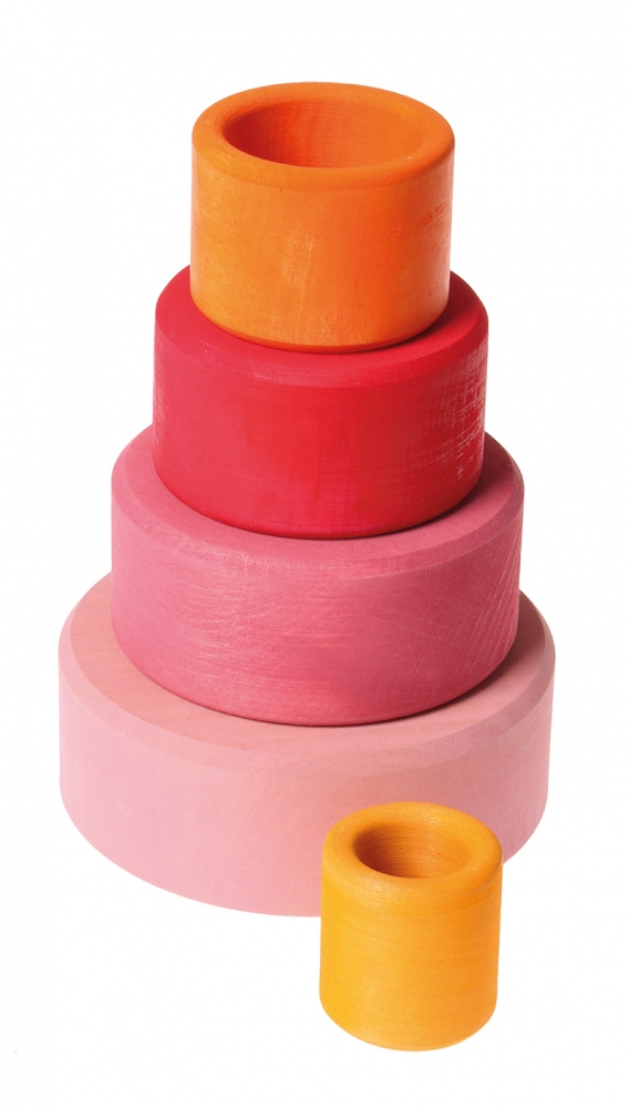 Set de 5 boluri din lemn de anin pentru bebelusi, colorate in nuante de roz si galben.