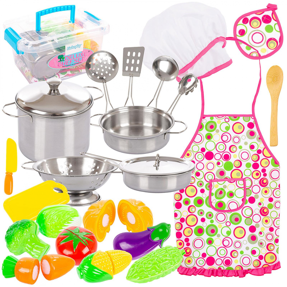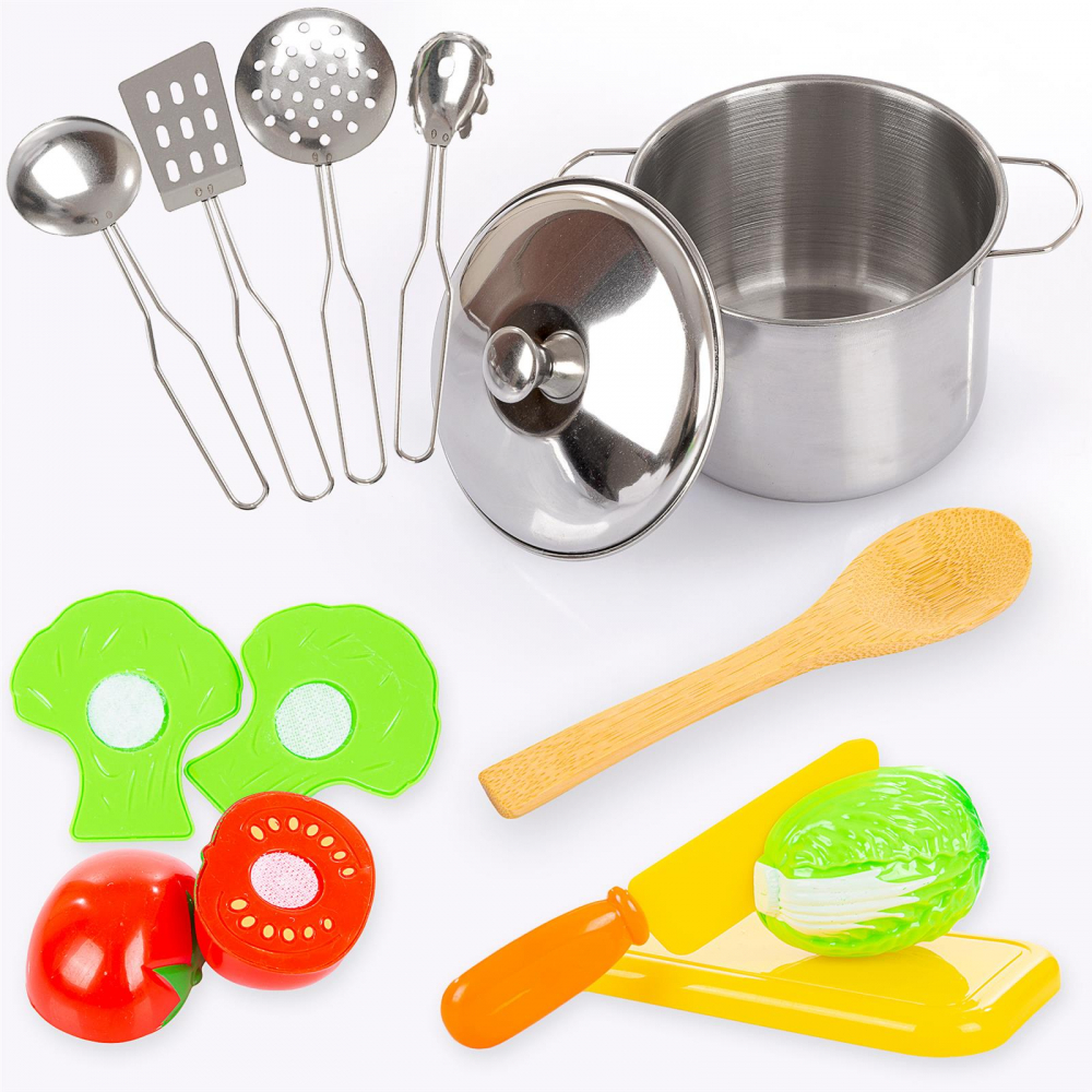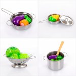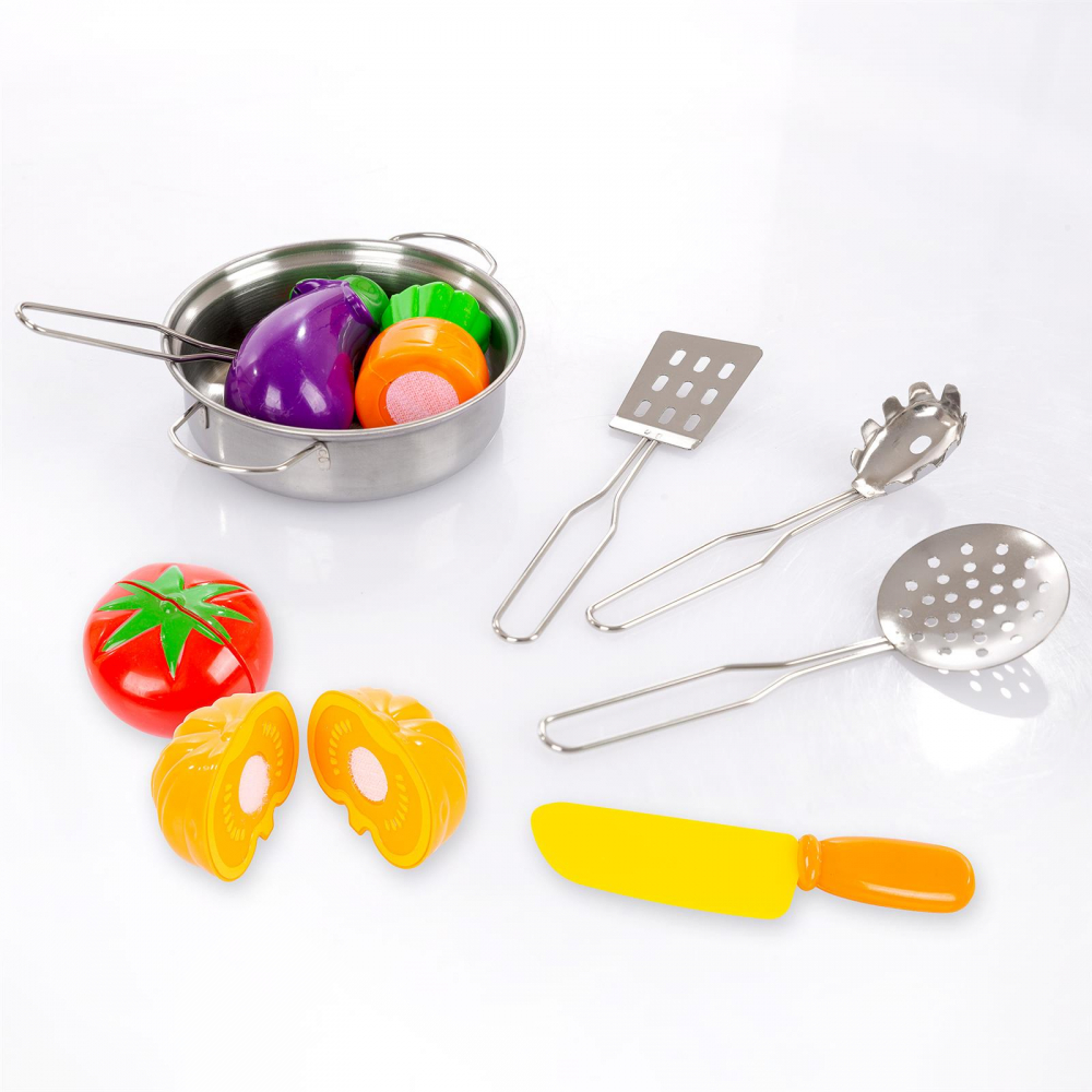 Set de bucatar cu Vase metalice, Legume cu Velcro pentru taiat, Sortulet, Boneta si accesorii specifice in cutie