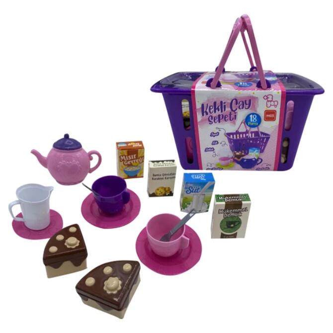 Cosul contine 18 accesorii utile pentru organizarea unui "ceai" pentru papusi: