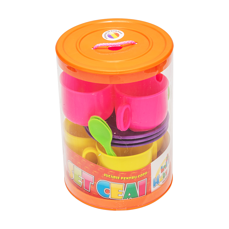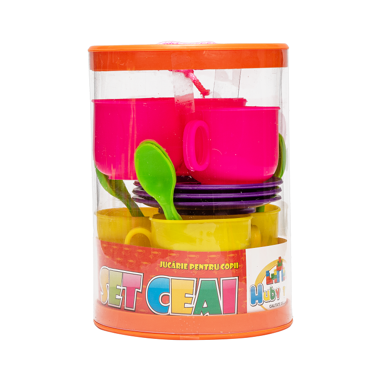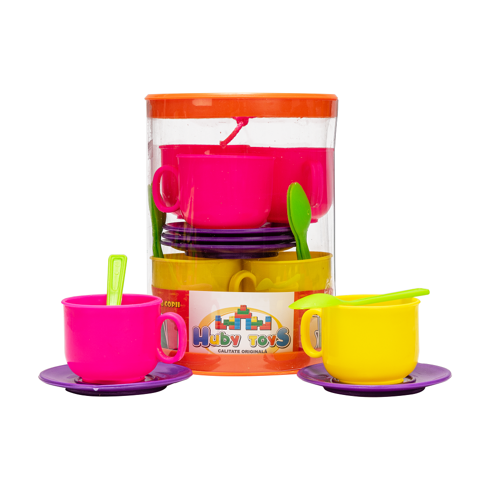 Set de ceai pentru copii Huby Toys Multicolor cu cescute, farfurioare si lingurite in cutie cilindrica transparenta
