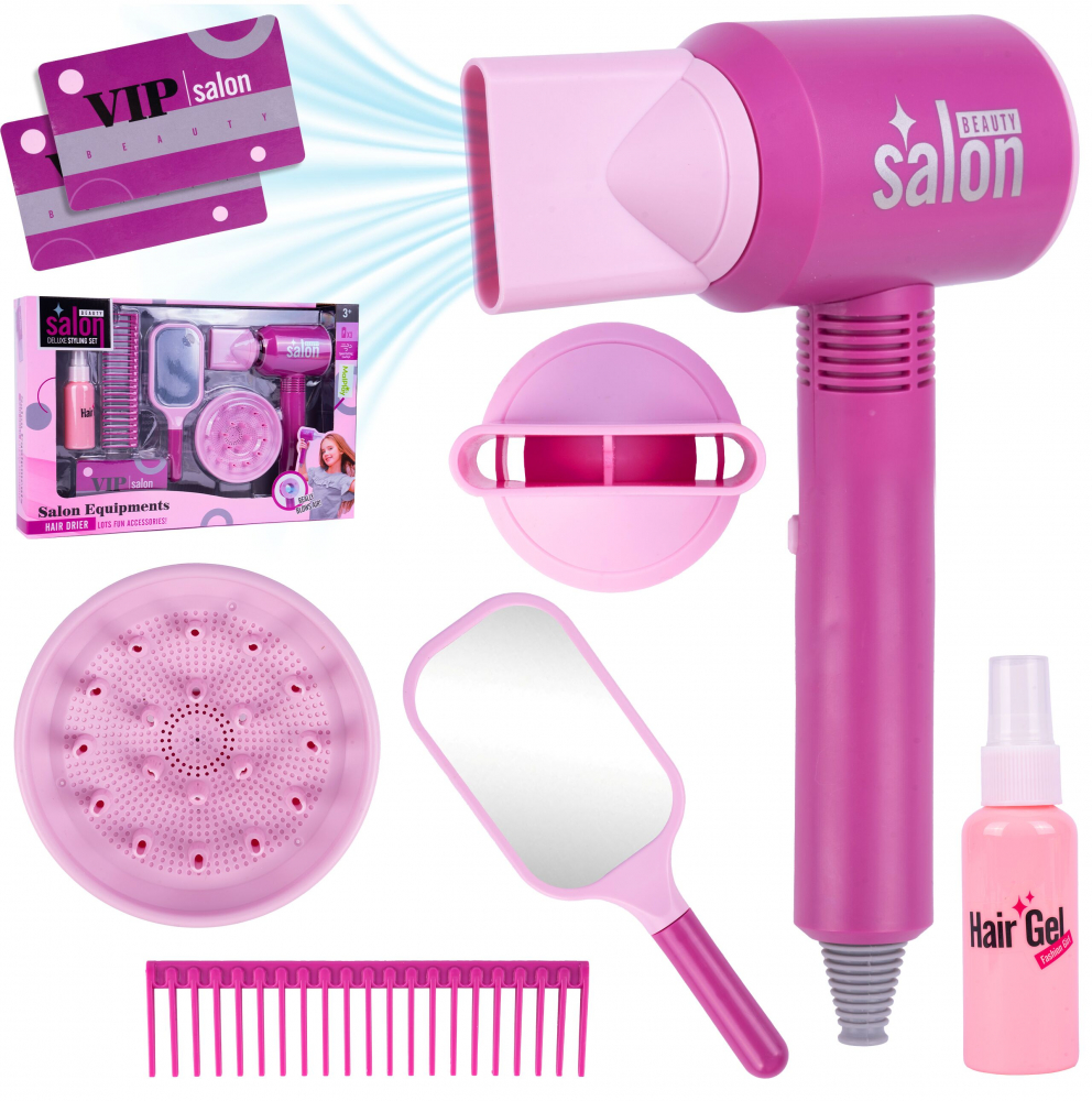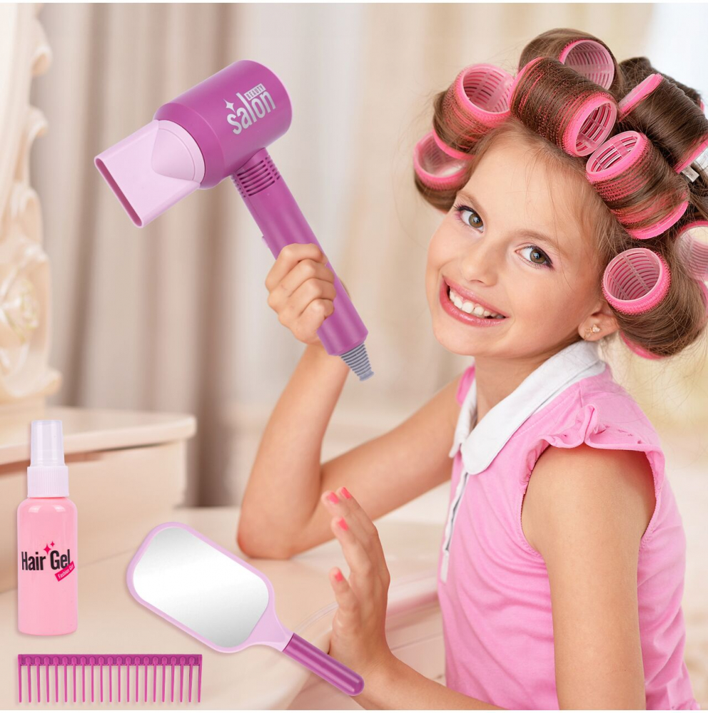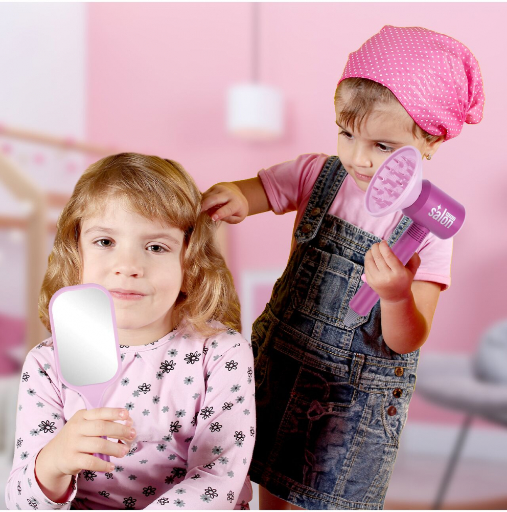 Setul include nu numai un uscator de par, ci si un pieptene, o oglinda, o sticla de gel de par si accesorii suplimentare pentru uscator. Toate acestea le permit copiilor să se joace într-o varietate de scenarii, dezvoltându-și imaginația și abilitățile manuale.