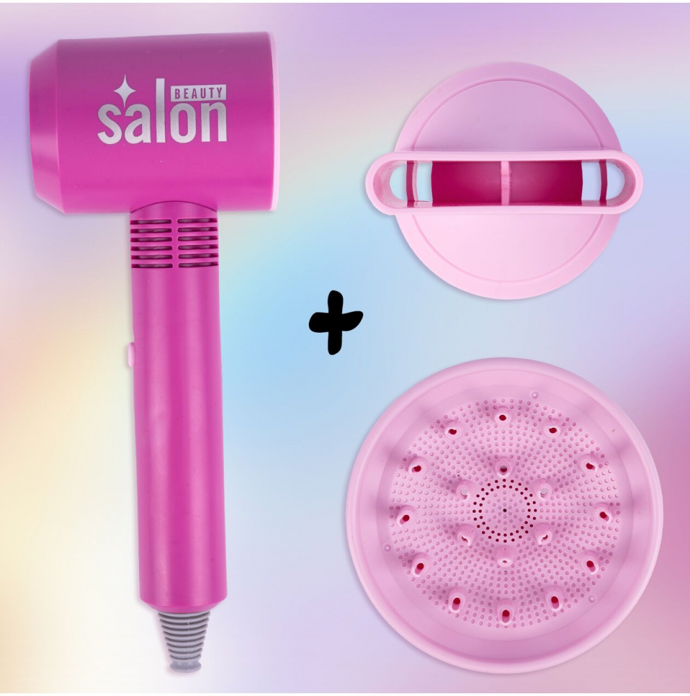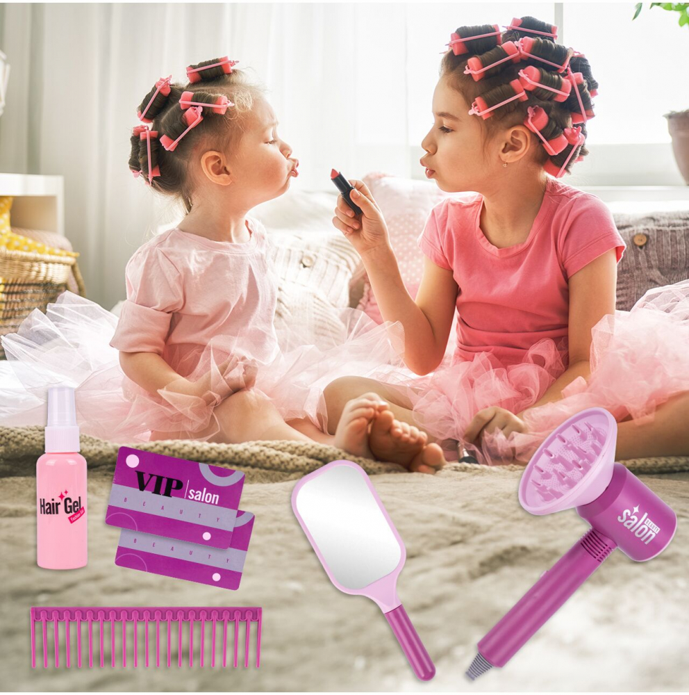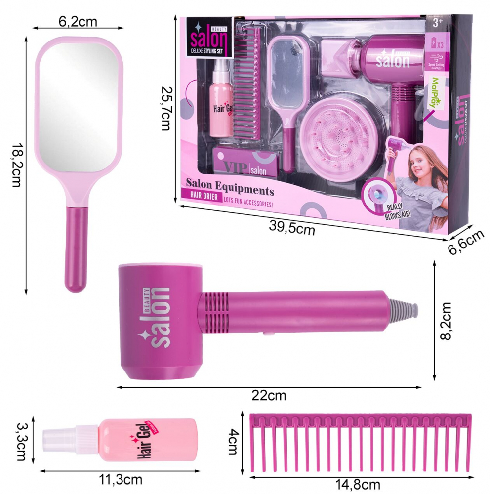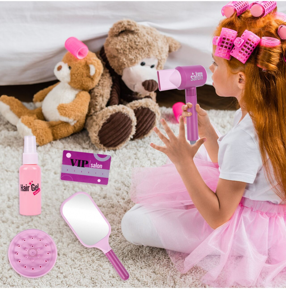 Setul include nu numai un uscator de par, ci si un pieptene, o oglinda, o sticla de gel de par si accesorii suplimentare pentru uscator. Toate acestea le permit copiilor să se joace într-o varietate de scenarii, dezvoltându-și imaginația și abilitățile manuale.
