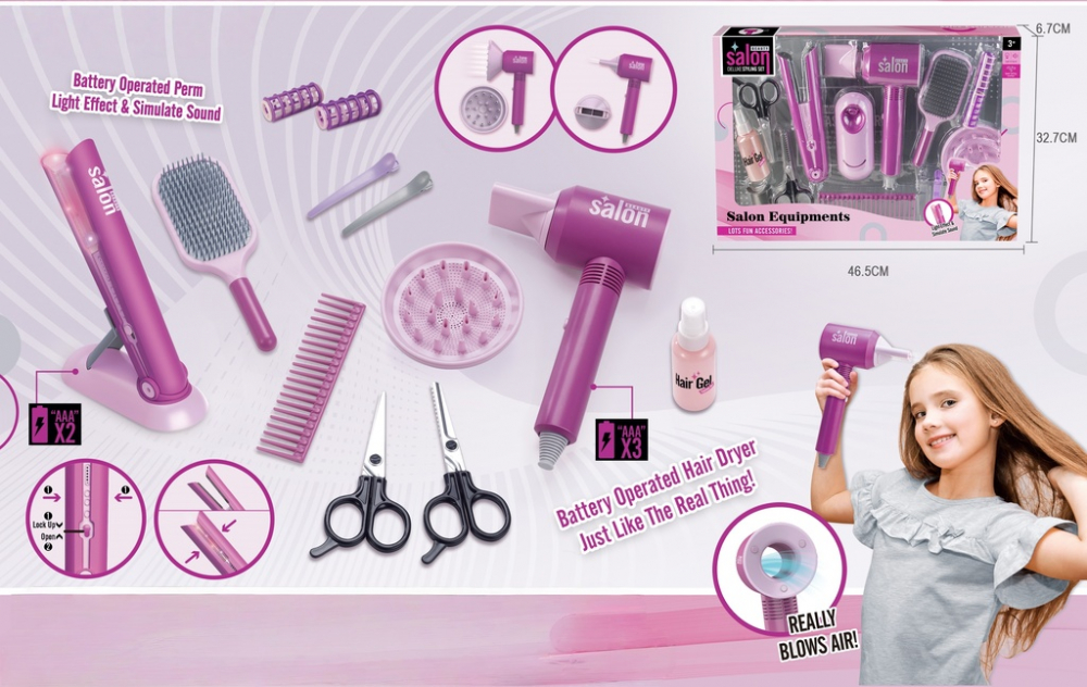 Setul include un uscator de par si o placa de indreptat parul care imita perfect functiile celor reale, dar sunt sigure pentru copii.