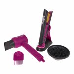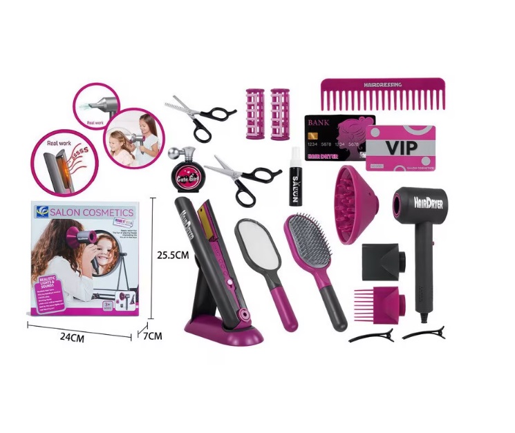 Cu uscator de par care sufla aer real si trei duze profesionale, plus placa de indreptat cu efecte sonore si luminoase, micul tau stilist va simti ca lucreaza intr-un salon adevarat.
