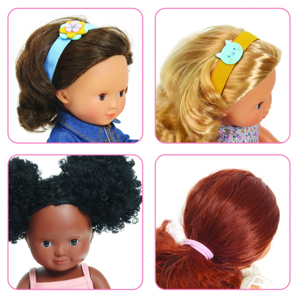 Este timpul să alegi o coafură, dar care? 3 bentițe de păr cu pisicuță sau flori care pot fi ușor așezate pe capul păpușii și 6 elastice de păr pentru codițe.