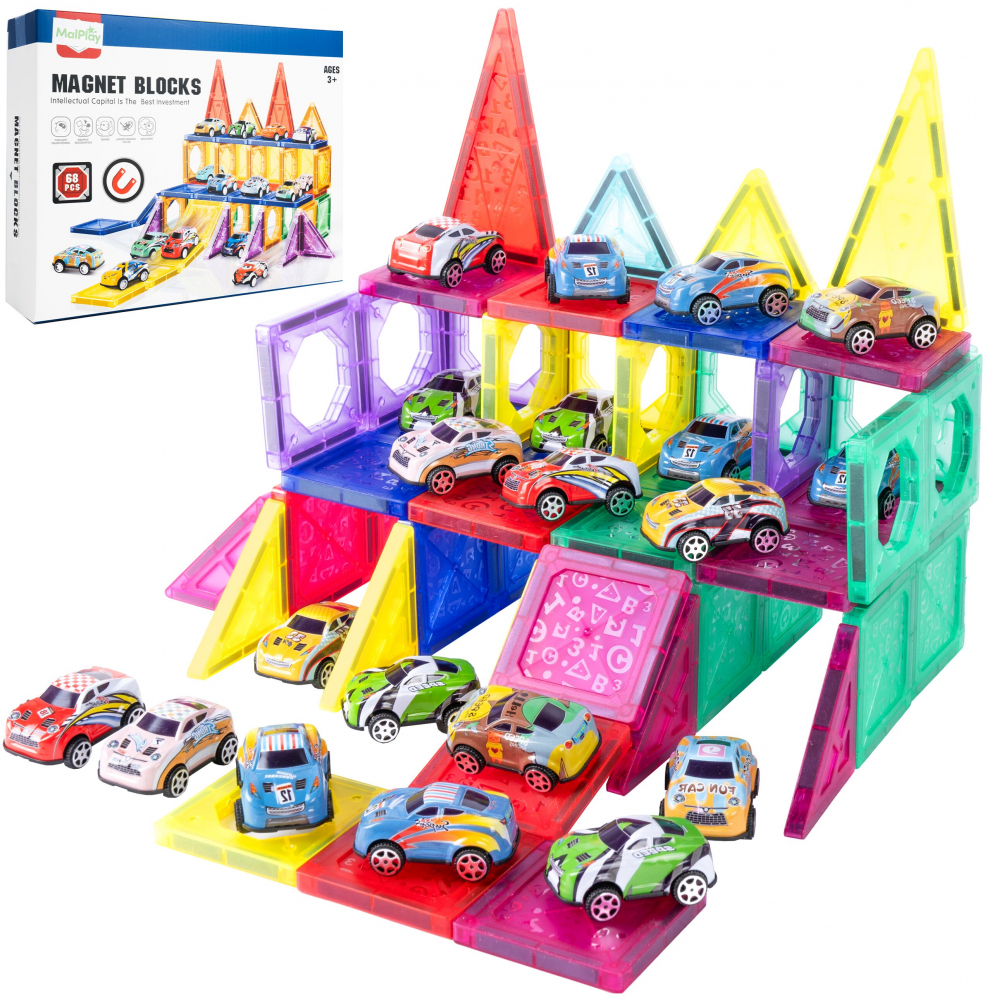 Set de constructie 3D pentru copii, Malplay, cu blocuri magnetice si 20 de masinute, 68 de piese