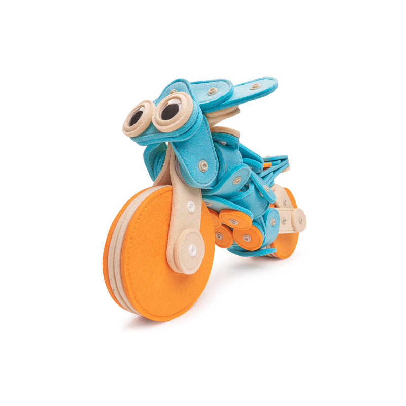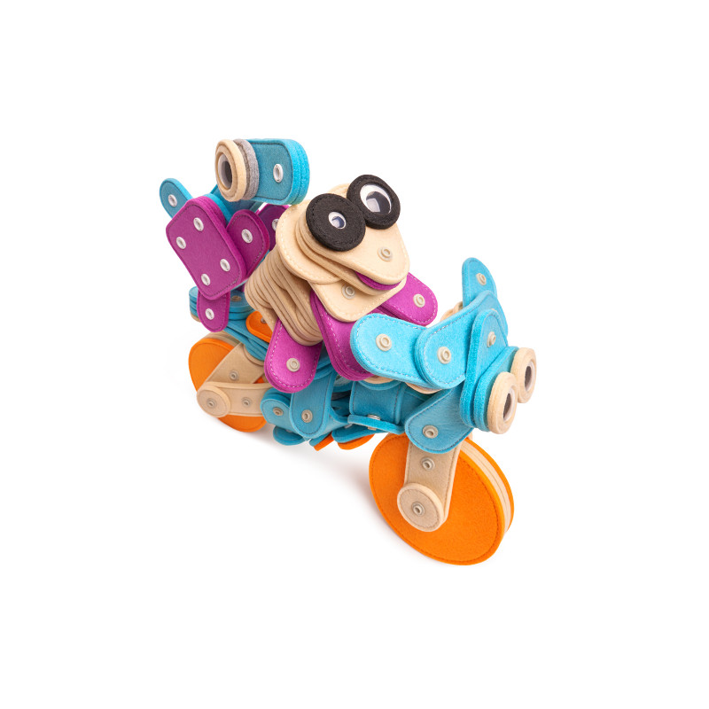 Setul de constructie din fetru Motocicleta este jucaria senzoriala perfecta pentru micii aventurieri. Avand 68 de piese din material moale, hipoalergenic, imaginatia copilului este libera sa creeze cele 4 design-uri standard sau sa inventeze noi forme si obiecte folosind aceste piese.