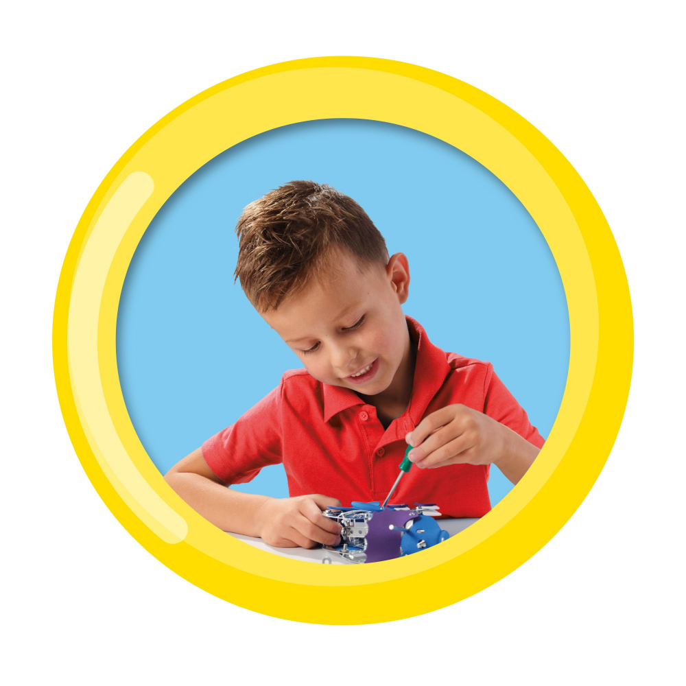 Decorul consta din piulite si suruburi, piese din spuma in patru culori si unelte, cum ar fi o surubelnita si o cheie.