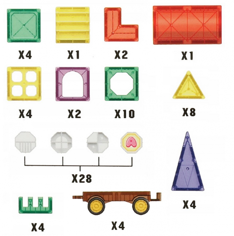 Setul contine: 4 sasiuri pentru a construi o masina; 4 triunghiuri isoscele; 8 triunghiuri echilaterale, 1 scara; 2 blocuri in forma de L; 1 baldachin; 4 blocuri in forma de obstacol; 10 blocuri patrate cu un octogon decupat; 4 blocuri patrate intregi; 4 blocuri patrate cu patru gauri; 2 blocuri patrate cu arc decupat; set de autocolante; 28 de piese octogonale.