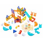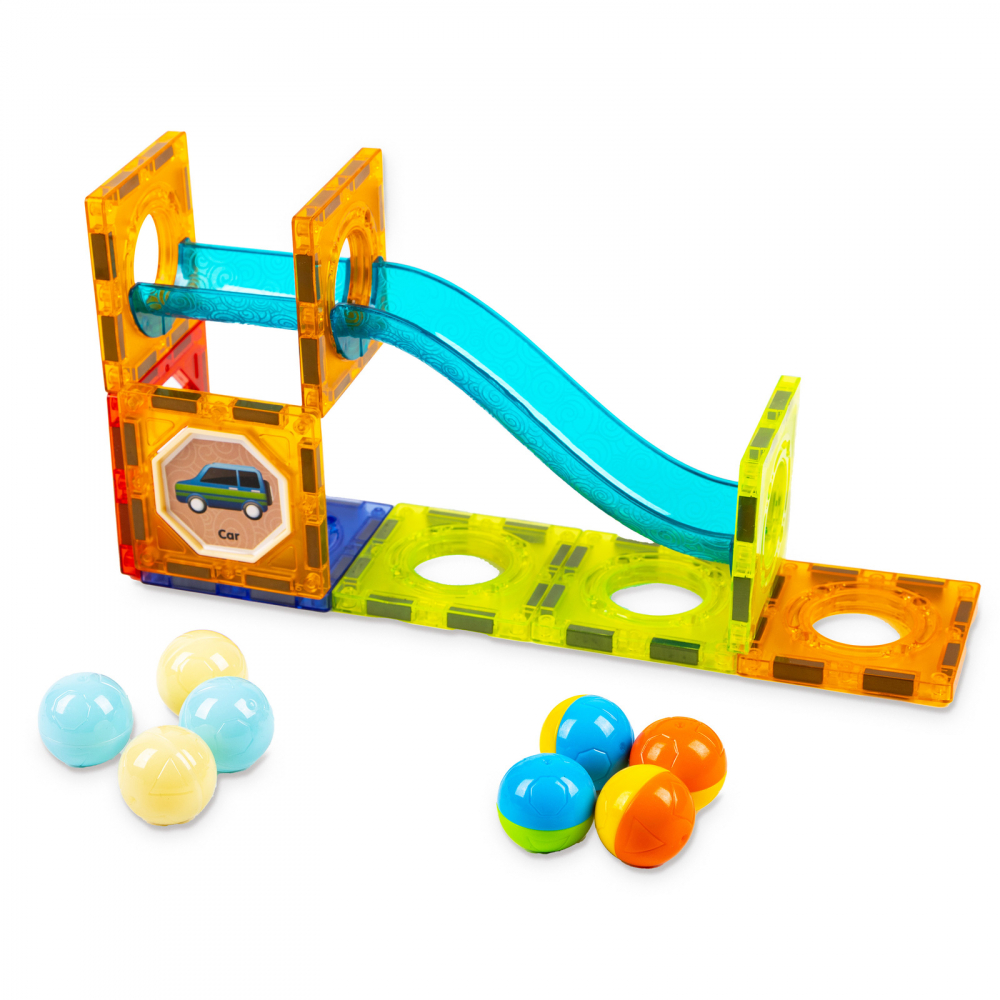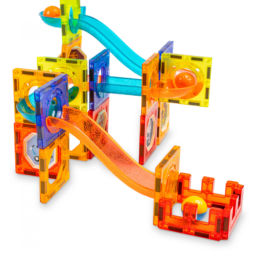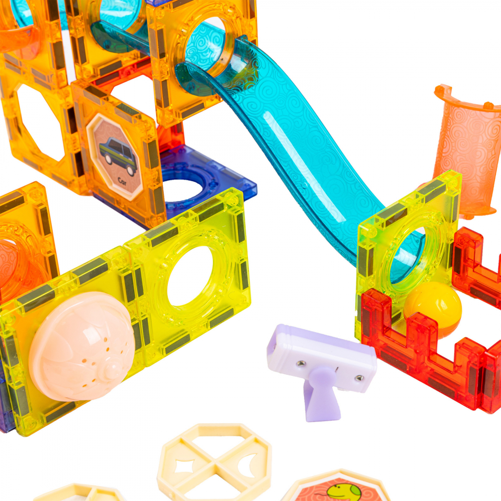 Set de constructie magnetic pentru copii Kinderplay, cu 75 elemente multicolore, cu bile si pista luminoasa RunSet