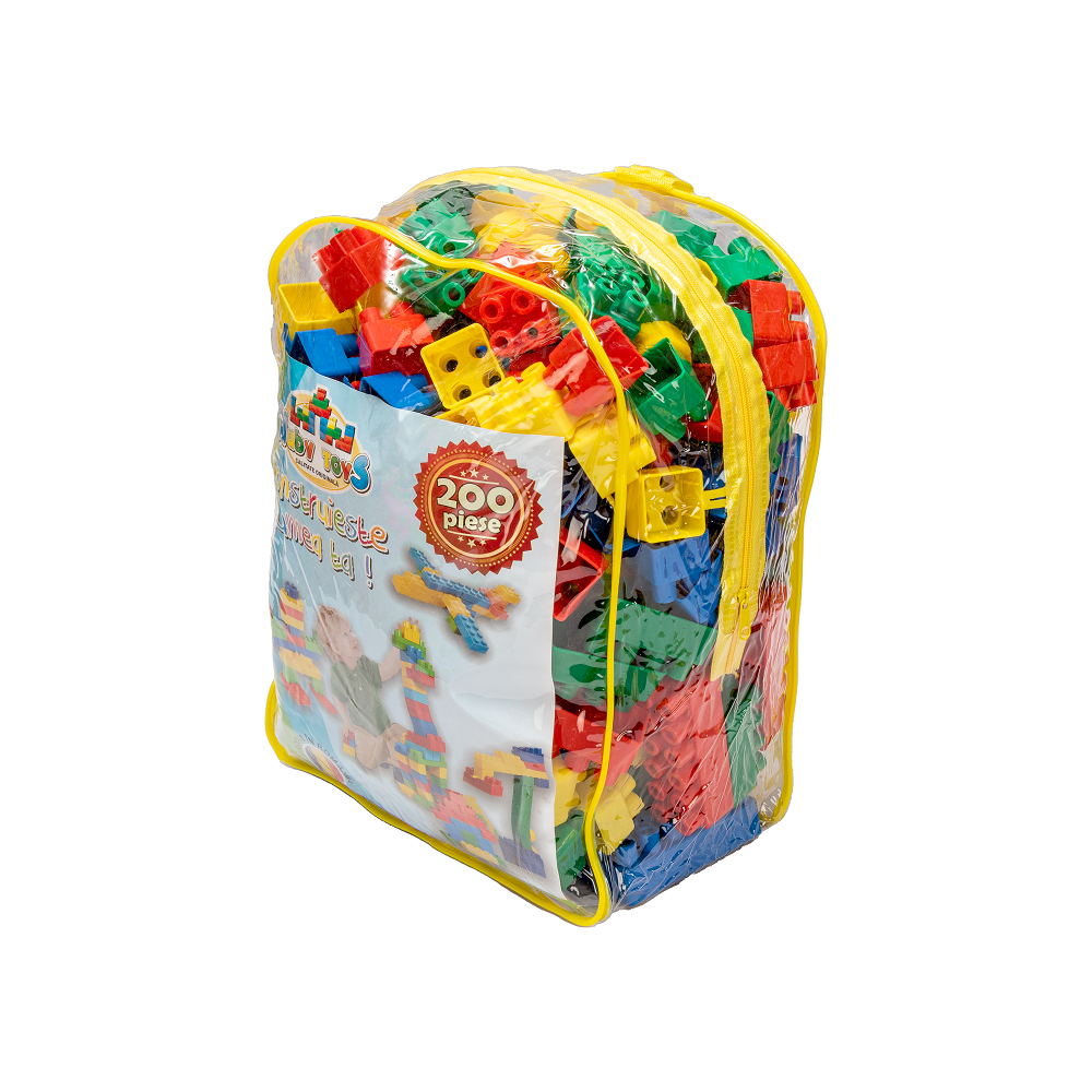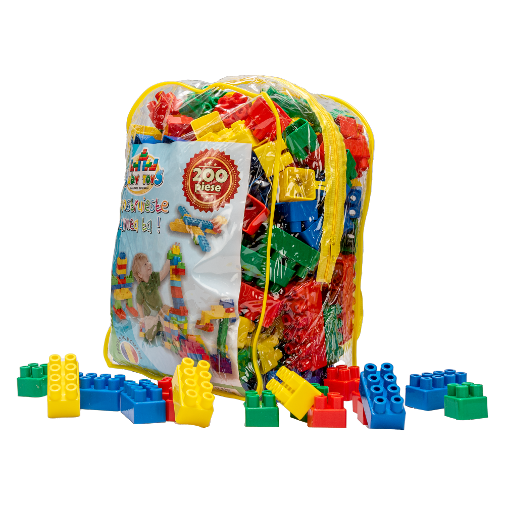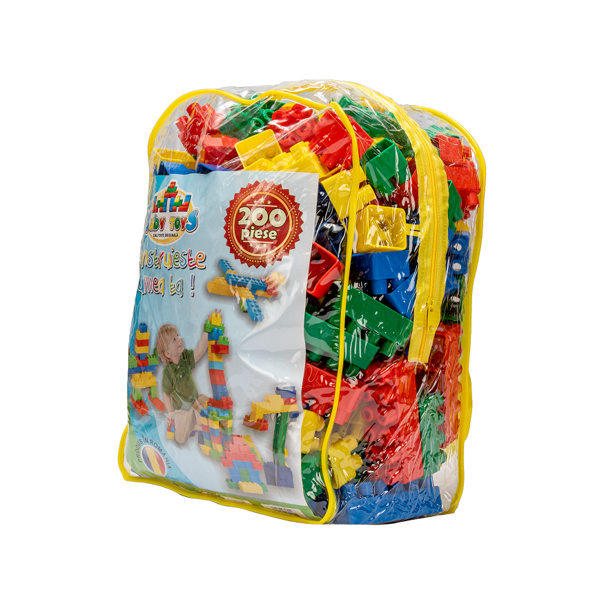 Set de constructie pentru copii Huby Toys cu 200 de cuburi multicolore in geanta de transport transparenta cu fermoar