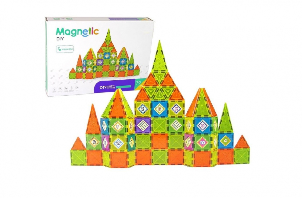 Cu 79 de piese colorate si magneti puternici, copiii isi pot folosi imaginatia pentru a construi structuri nelimitate, de la castele la roboti si multe altele.