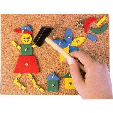 setul include 229 piese: tablita din pluta, un ciocanel, pioneze si diferite piese din lemn