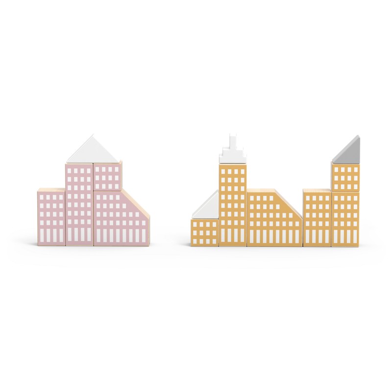 Set de cuburi din lemn pentru realizarea arhitecturii unor orase moderne cu zgarie-nori.