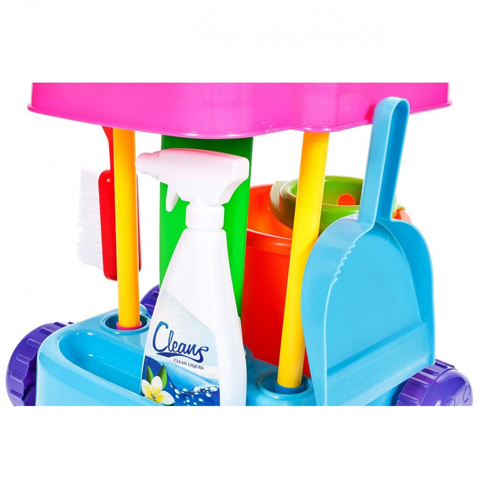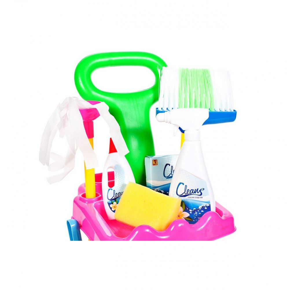 Un carucior echipat cu diverse accesorii de curatare care imita adevaratele instrumente de curatare.