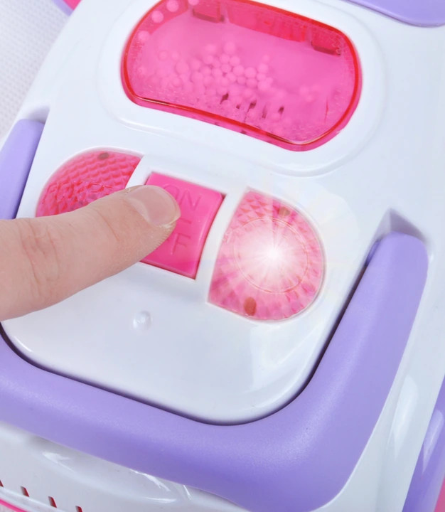 * Aspiratorul scoate un sunet ca unul real, iar intrerupatorul se aprinde. Porniti jucaria si urmariti cum aspiratorul aspira mingile de gunoi de imitatie atasate.