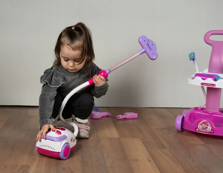 Set de curatenie pentru copii, MalPlay, carucior cu maner echipat cu aspirator, matura, foras, perie si accesorii esentiale