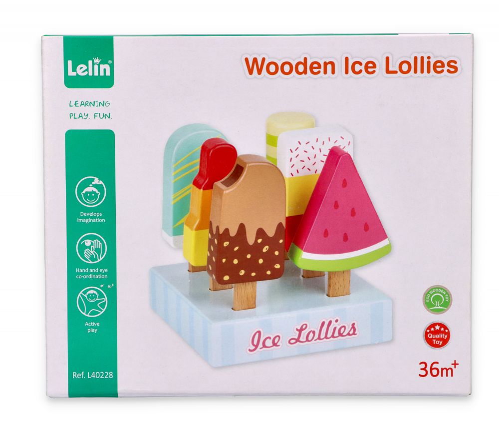 Setul de inghetate pe bat cu suport Lelin L40228 contine 6 inghetate pe bat viu colorate, din lemn.
