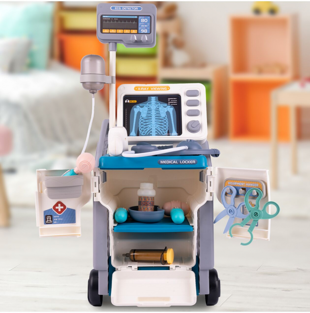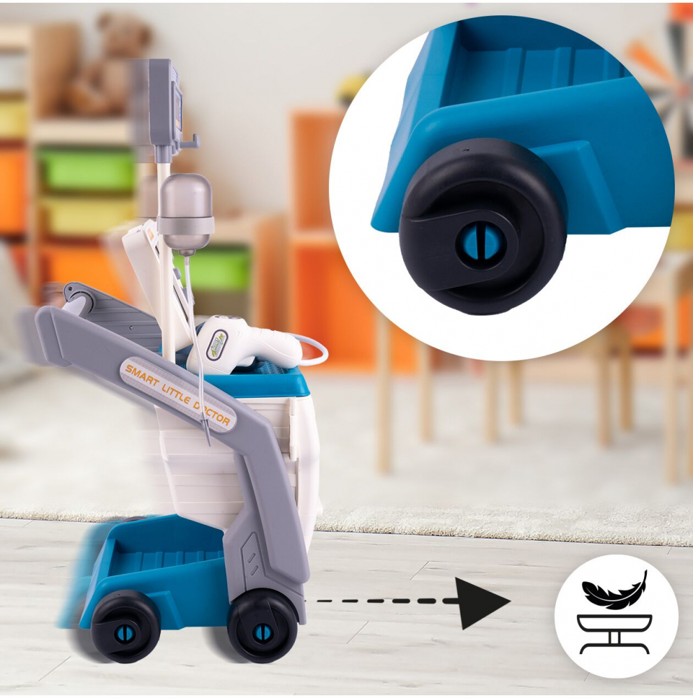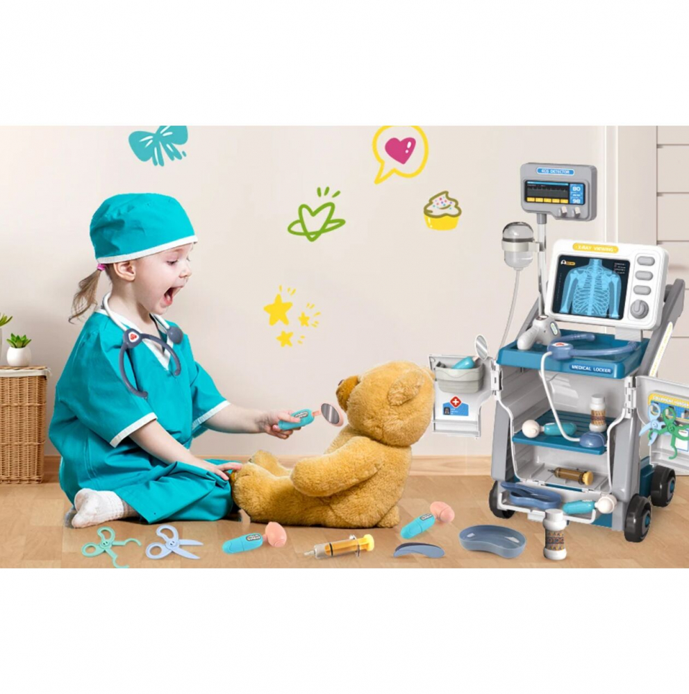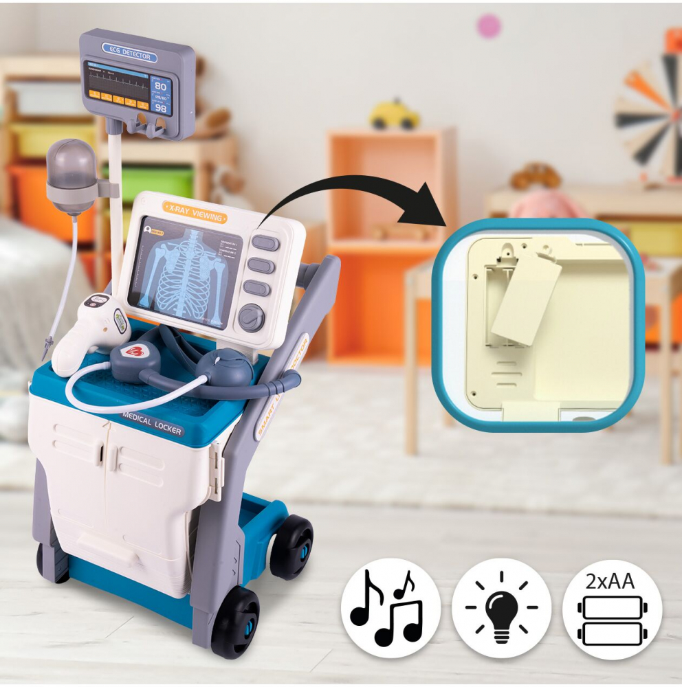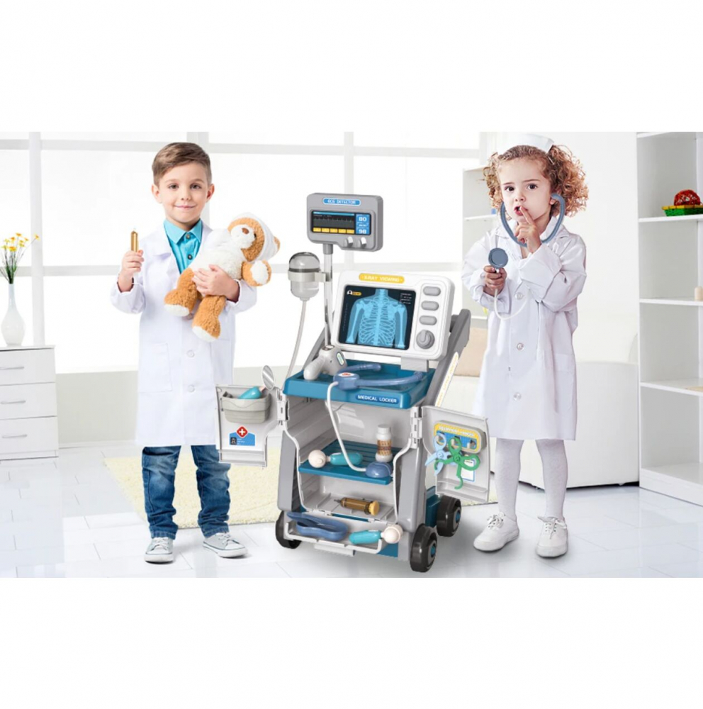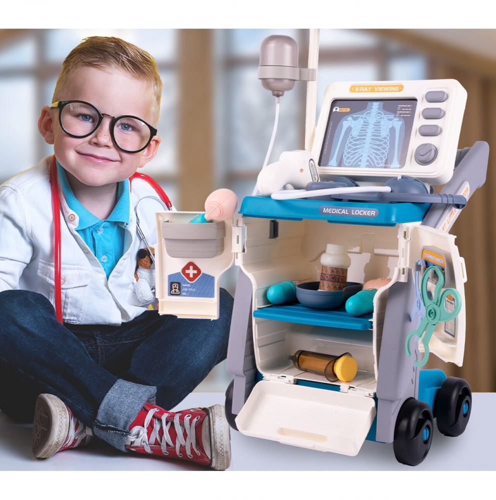 Set de joaca Carucior Medical mobil pe roti, cu 15 accesorii esentiale incluse, cu efecte Sonore, 56.5 x 23 x 20 cm, Blue