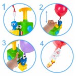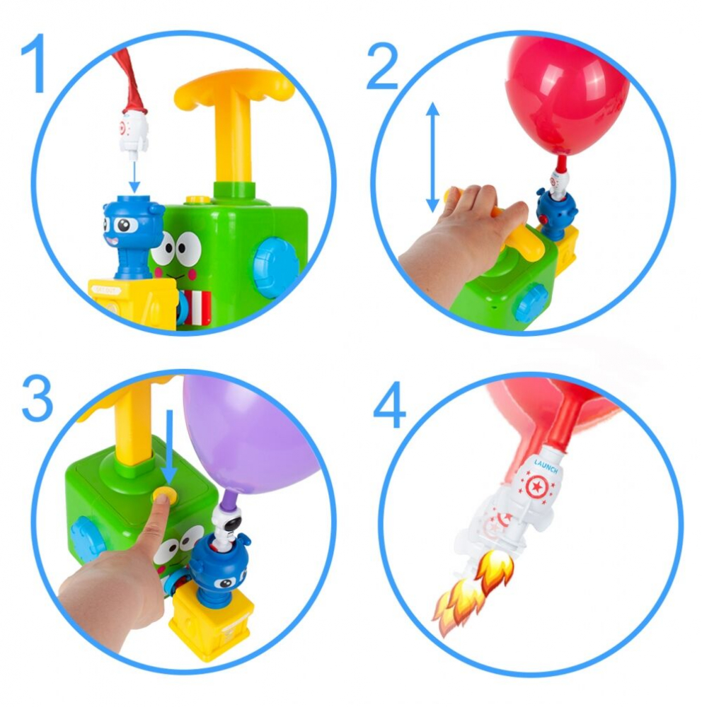 Este nevoie doar de 3 pasi pentru a pune vehiculul sau jucaria in miscare (1.Atasati vehiculul balon pe pompa->2.Umflati balonul->3.Apasati butonul