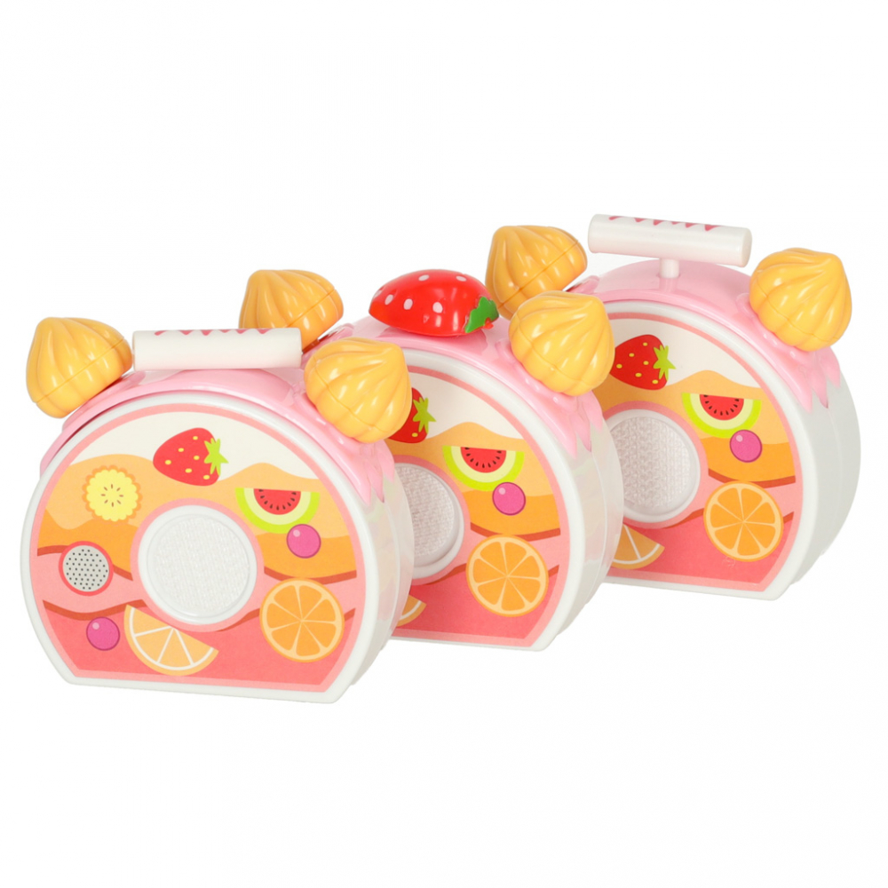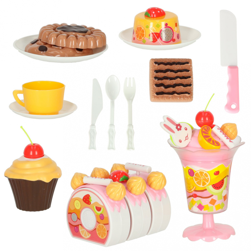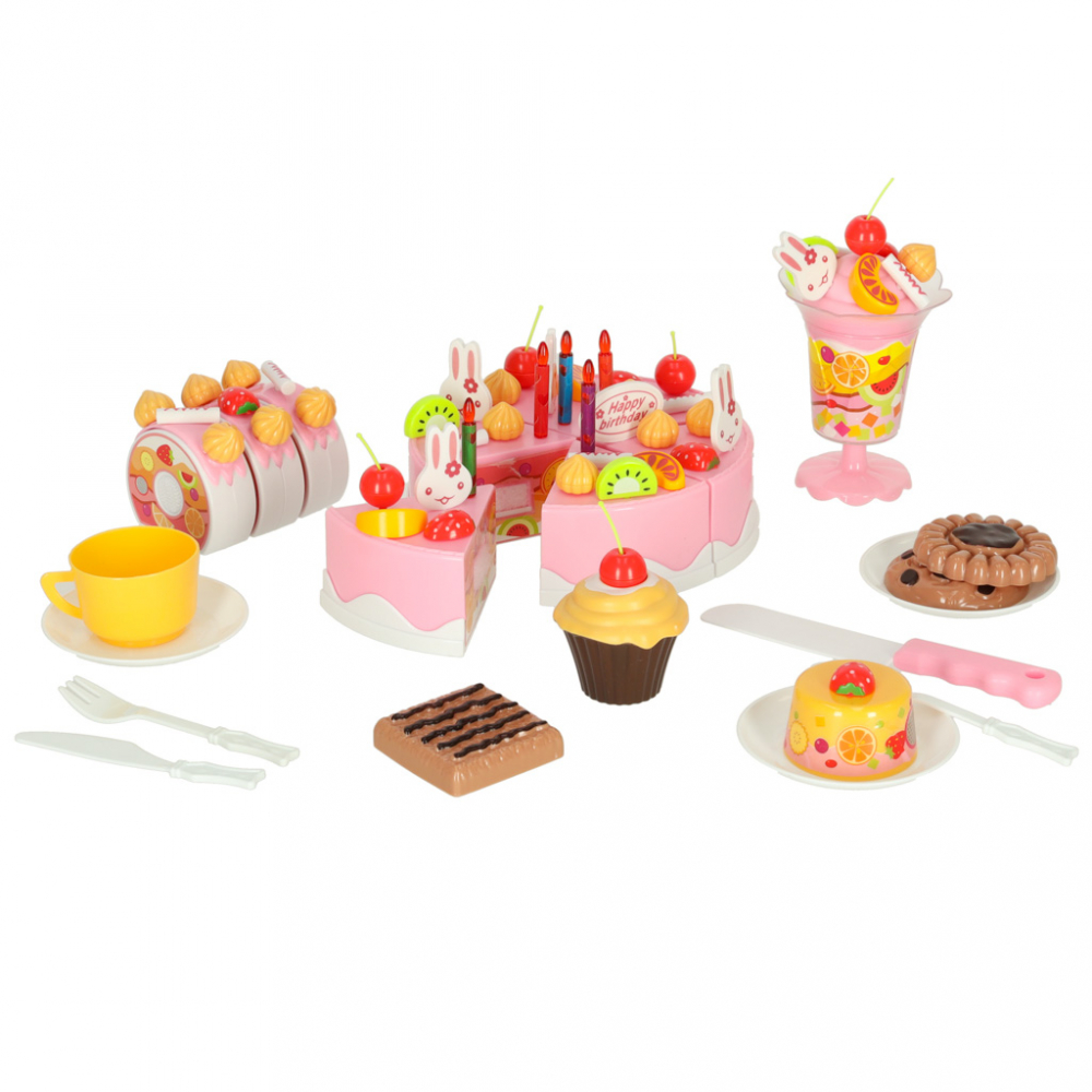 Set de joaca pentru copii, Ikonka, tort aniversar feliabil cu prindere velcro, si prajituri, 75 elemente, happy birthday pink