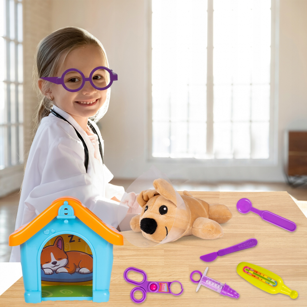 Set mare de accesorii veterinare: Include stetoscop, seringa, termometru, ochelari, foarfeca, "bisturiu" (pentru joaca), bandaj, guler de protectie, bol cu mancare si multe altele.