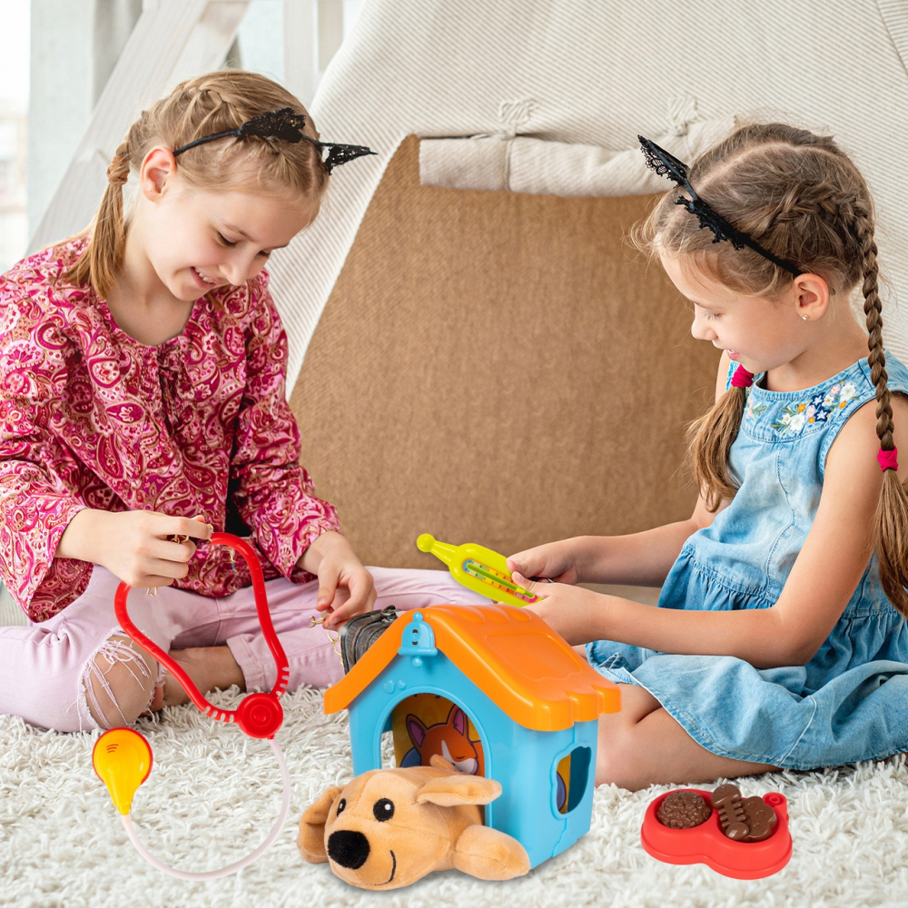 Acest set complet contine un caine de plus, o canisa si o gama larga de accesorii medicale, permitandu-i copilului sa-si imagineze si sa se joace de-a medicul veterinar.
