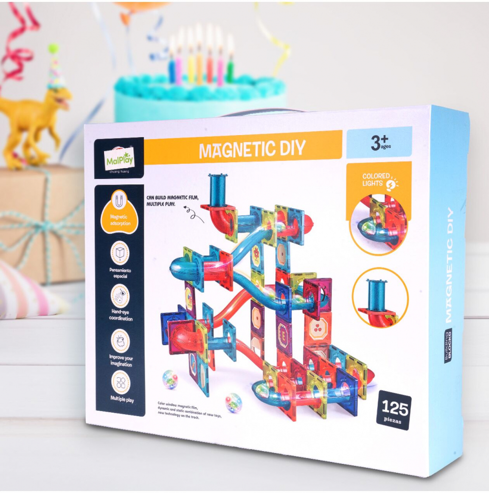 * Acest set educativ este creat in mod special pentru a ajuta copilul sa formeze o structura 3D speciala cu tobogane, si piste de bile stralucitoare.