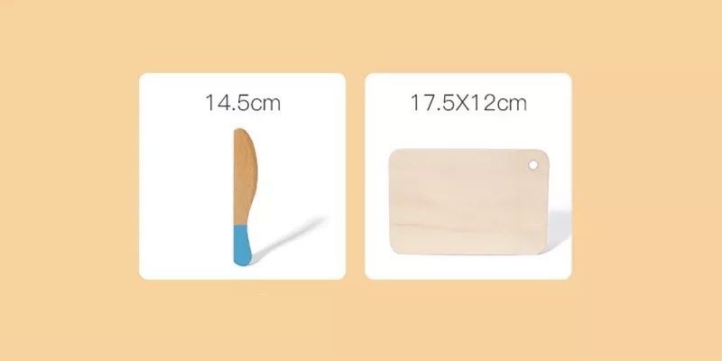 Set de cutite: Este inclus si un cutit din lemn, care este potrivit pentru maini mici. Un copil isi poate exersa abilitatile de taiere fara a se pune in pericol.