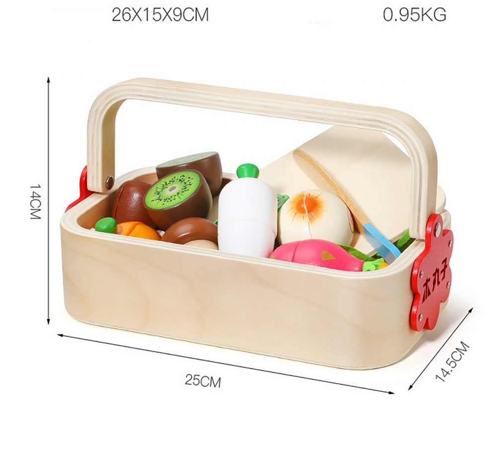 Set de joaca pentru copii, NiceKids, Cosulet cu fructe si legume din lemn pentru feliat, cu prindere magnetica, 25 x 14.5 x 14 cm