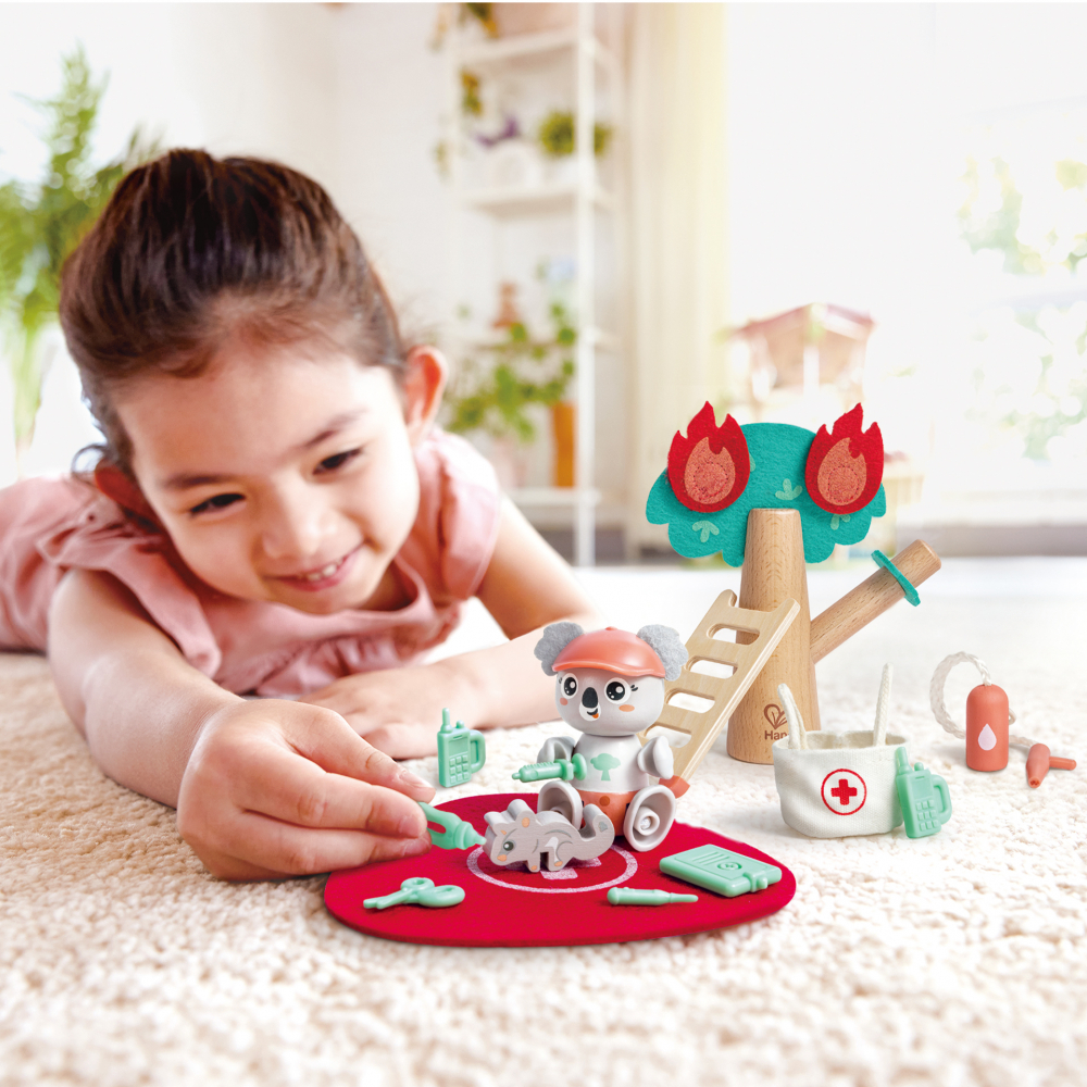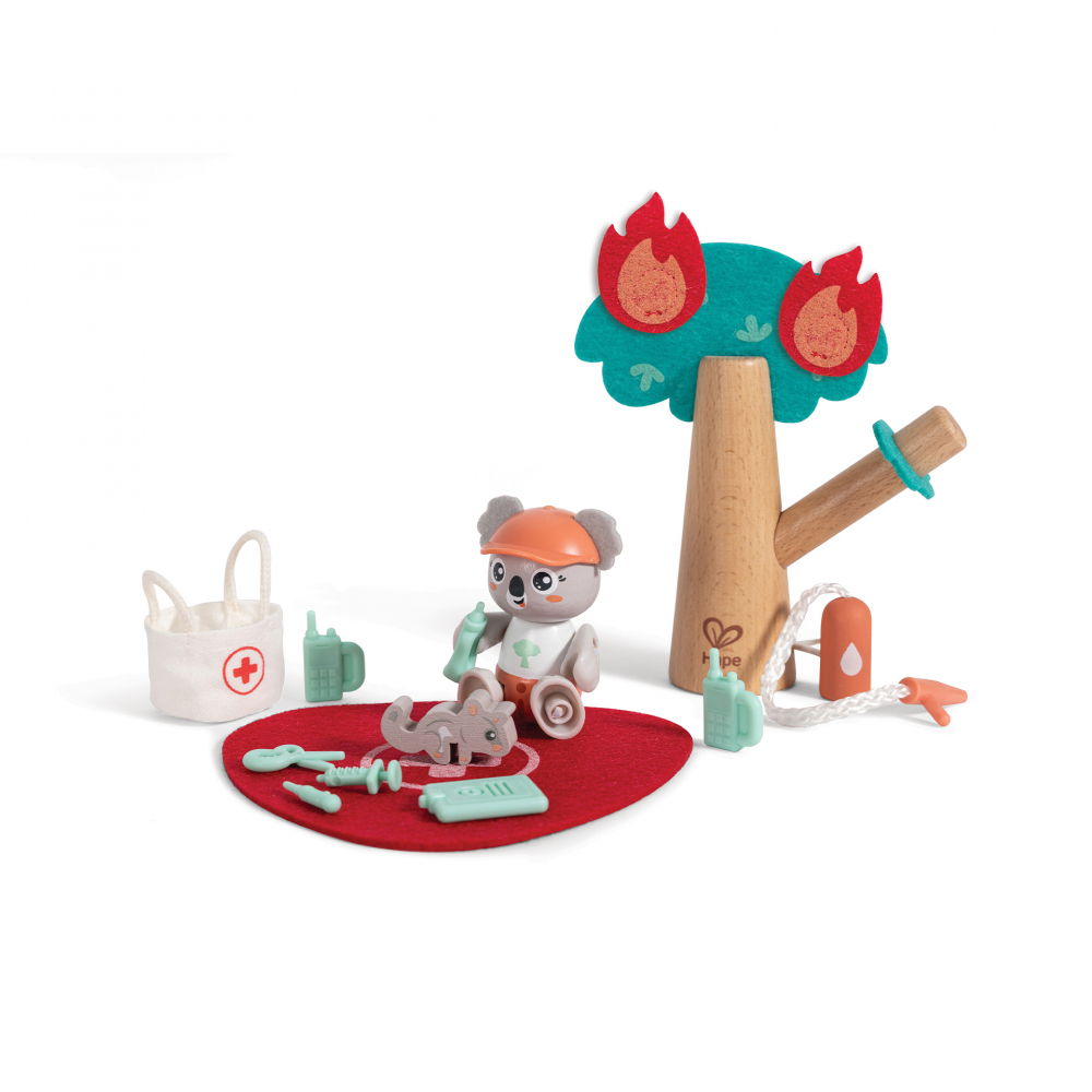 Acest set include 1 copac, 1 koala, 1 planor de zahar, 1 stingator de incendiu, 2 flacara de pasla, 1 palarie, 1 geanta de prim ajutor, 2 walkie-talkie, 1 termometru, 1 biberon, 1 seringa, 1 fisa medicala, 1 foarfeca, 1 covoras de pasla, 1 scara si 1 pliant.
