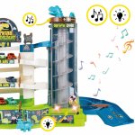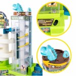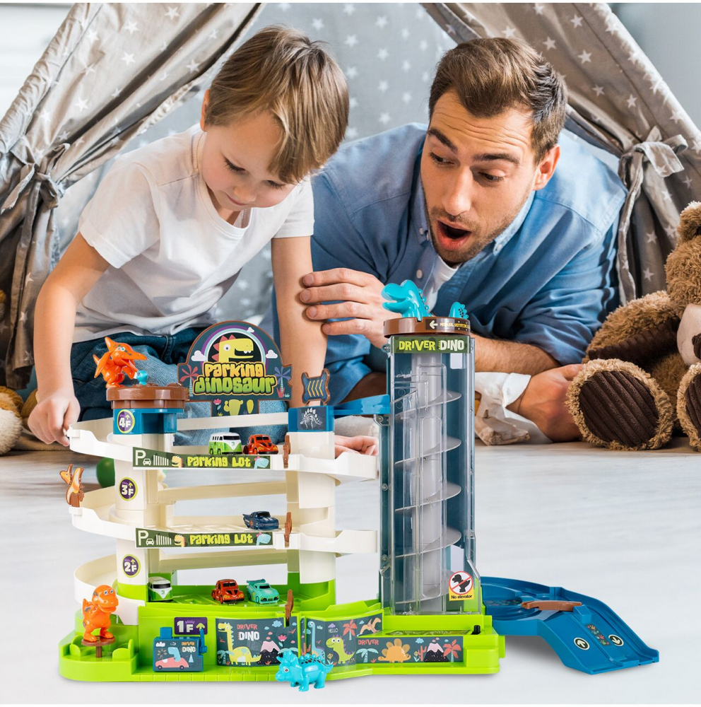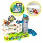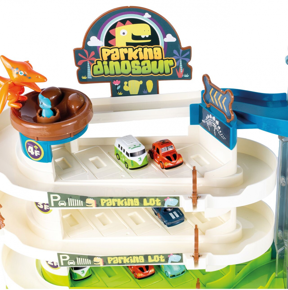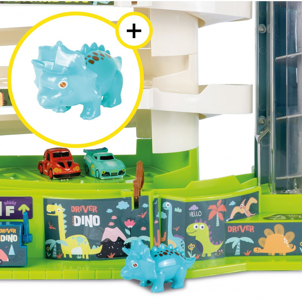 Set de joaca supraetajat cu 4 nivele, Lift mobil care transporta 6 masinute colorate intre etaje, cu Tobogan cu curbe, 2 figurine de dinozauri, efecte sonore si luminoase, Parking Dinosaur
