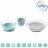 Setul este compus din farfurie, bol si pahar din sticla securizata, insotite de baze flexibile antiaderente. Concepute pentru a evita incidentele, bazele flexibile ale farfuriei si bolului au ventuze pentru a adera la masa sau la tavita scaunului de masa.
