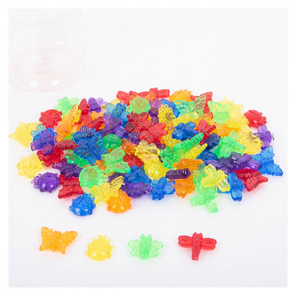 - Setul contine 96 de piese din plastic translucid colorat: 4 modele diferite de insecte (buburuze, libelule, fluturi, albine) in 6 culori vibrante(rosu, portocaliu, galben, verde, albastru si violet) si un borcan de depozitare din plastic.