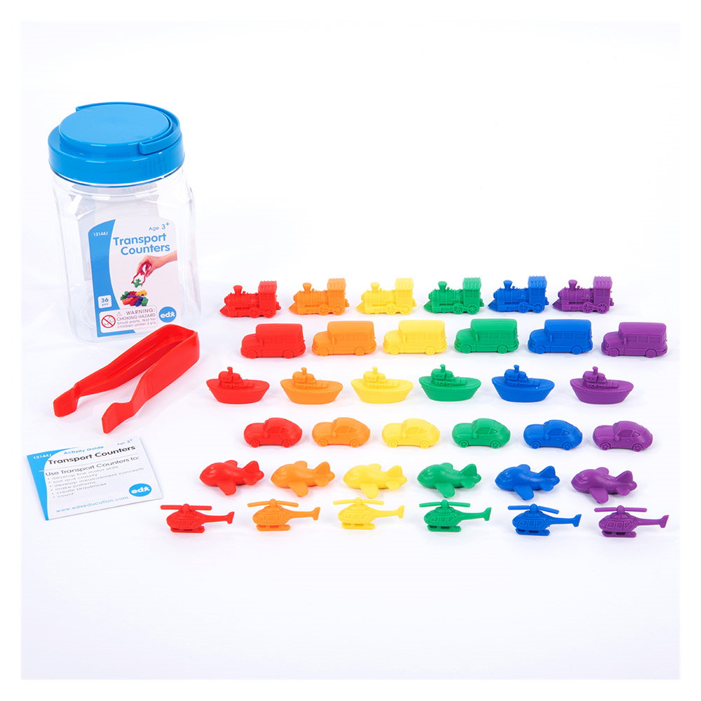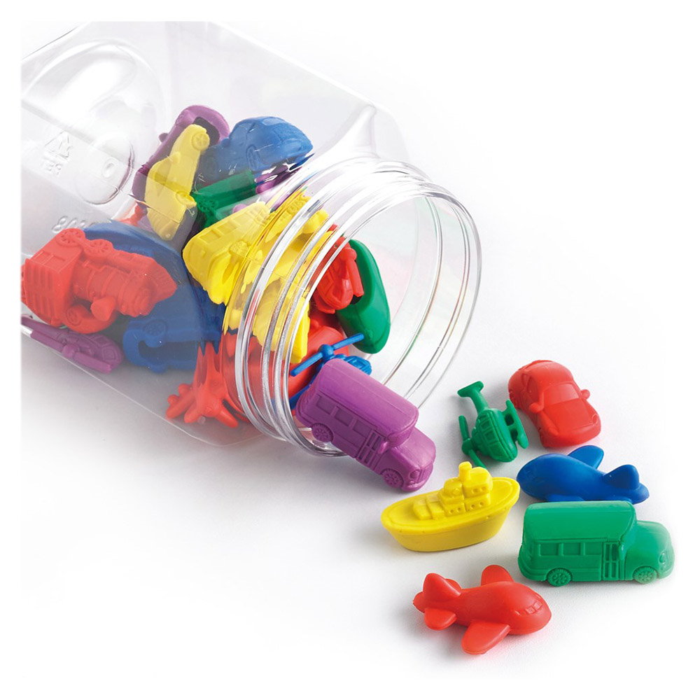 - Setul cuprinde: 36 de mijloace de transport in sase modele si culori diferite, realizarte din plastic moale, un borcan cu capac si maner si o penseta din plastic.