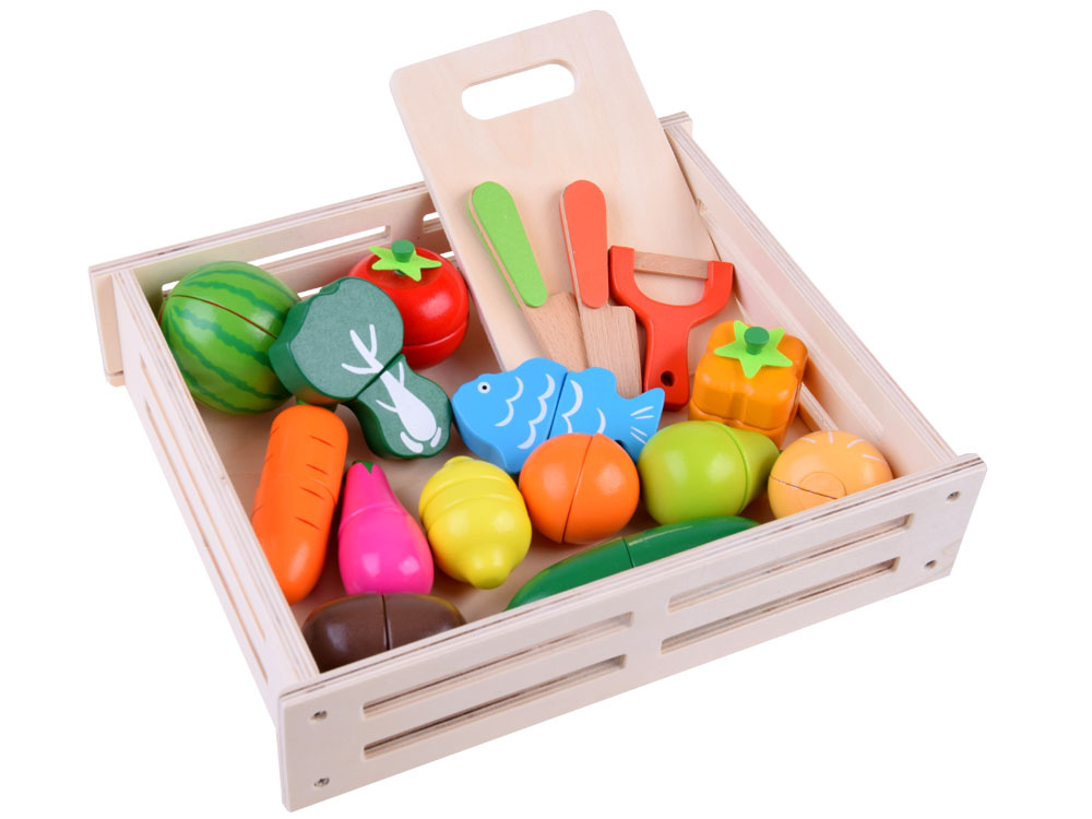 Set de taiat pentru copii, cu fructe si legume cu prindere magnetica in cutie din lemn, dimensiune 28 x 23.5 x 6.5 cm